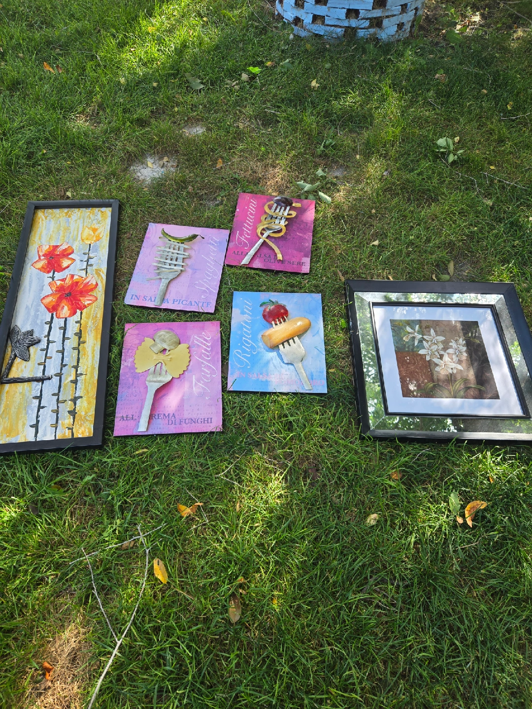 Selling a collection of framed art prints. There are five pieces in total, each with a unique design. Great for adding a touch of creativity to any room all for $15