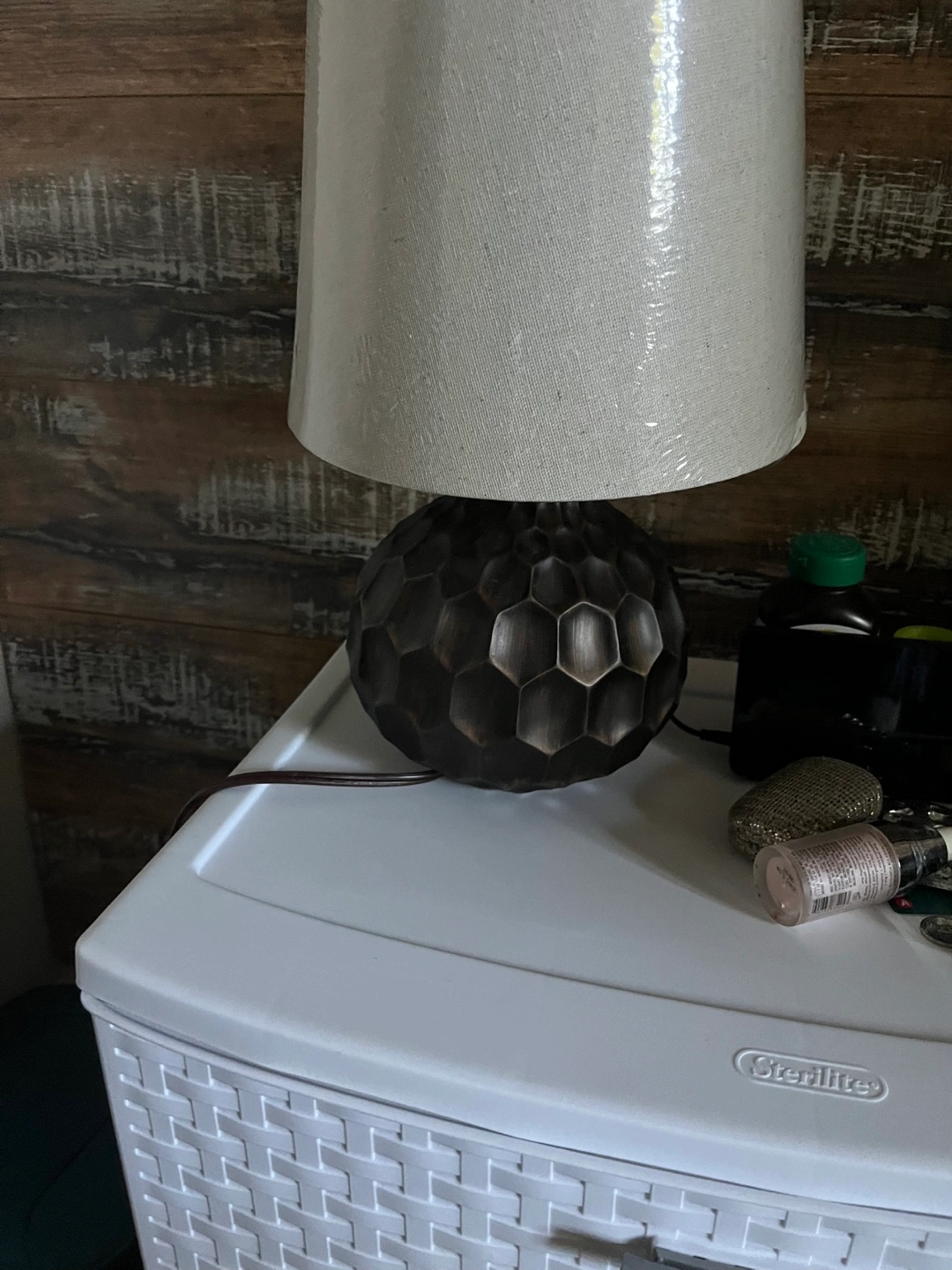 Selling a table lamp with a unique, textured base and a neutral-toned lampshade. It adds a touch of style to any room! The base has a cool, geometric design. Perfect for a bedside table or living room side table shade is brand new lstill packed