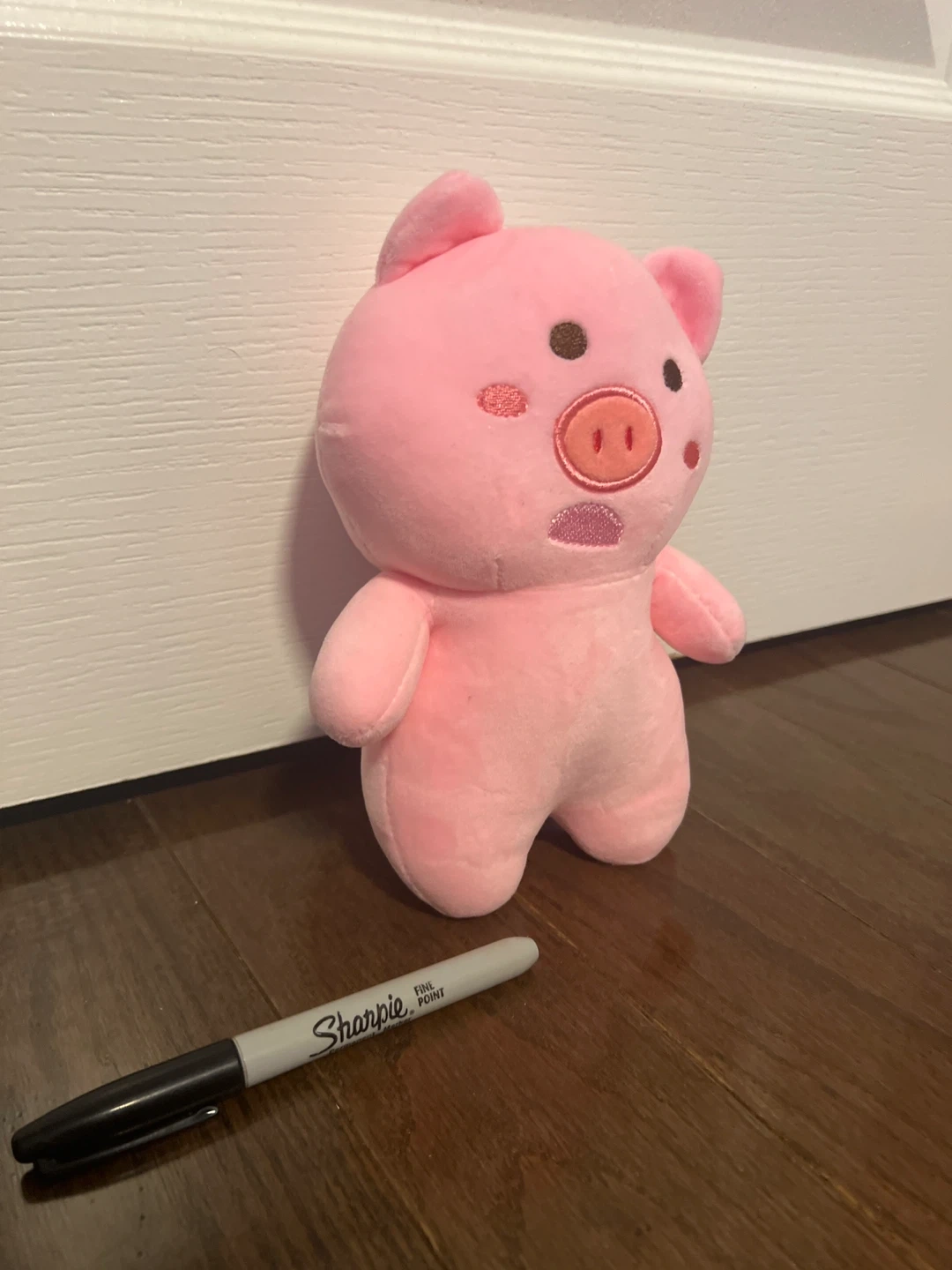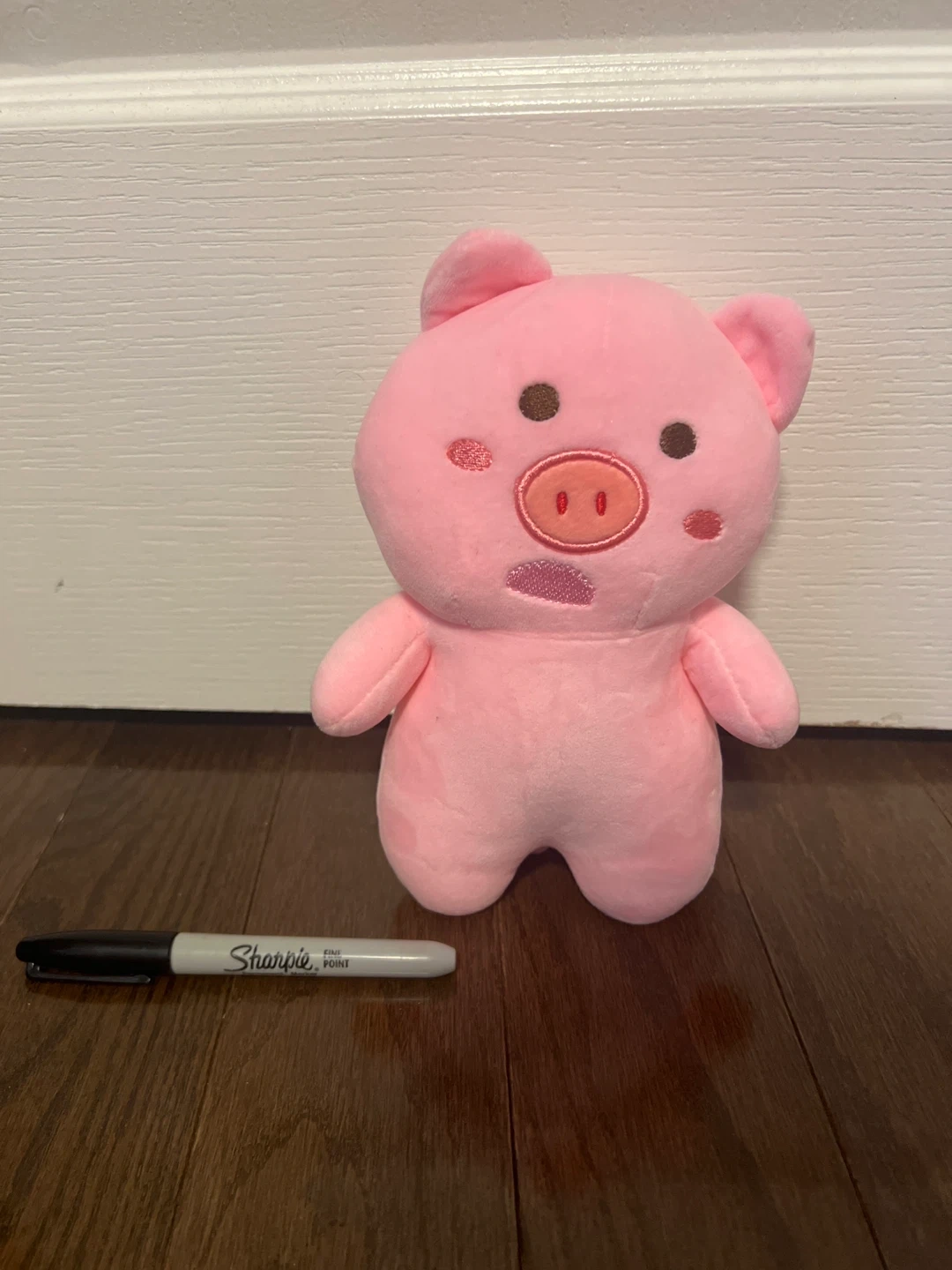 A cute pink pig plushie! Has a very dazed and quirky face.