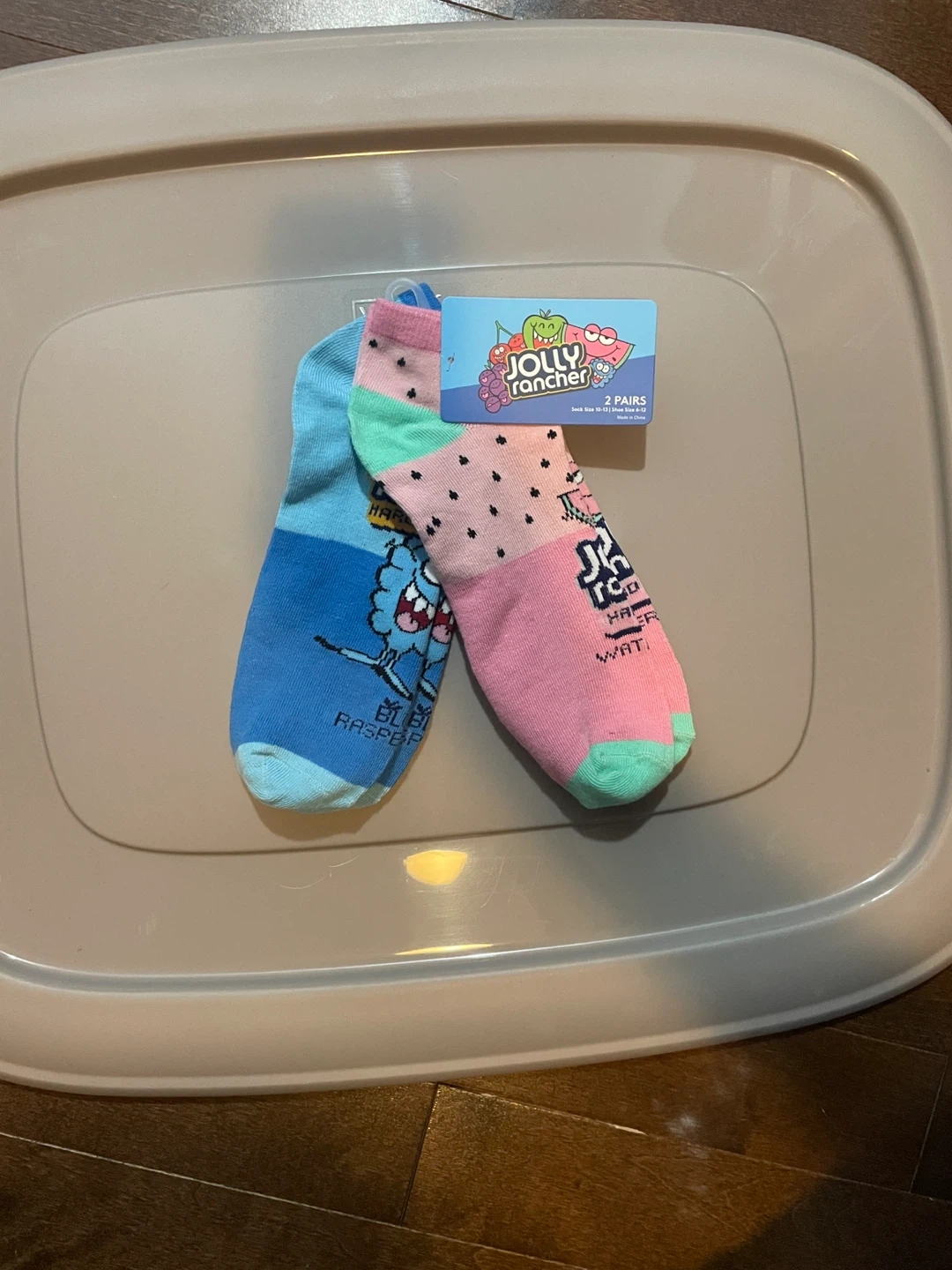 Here are two pairs of Jolly Rancher socks! One is pink and the other is blue. They are new with tags