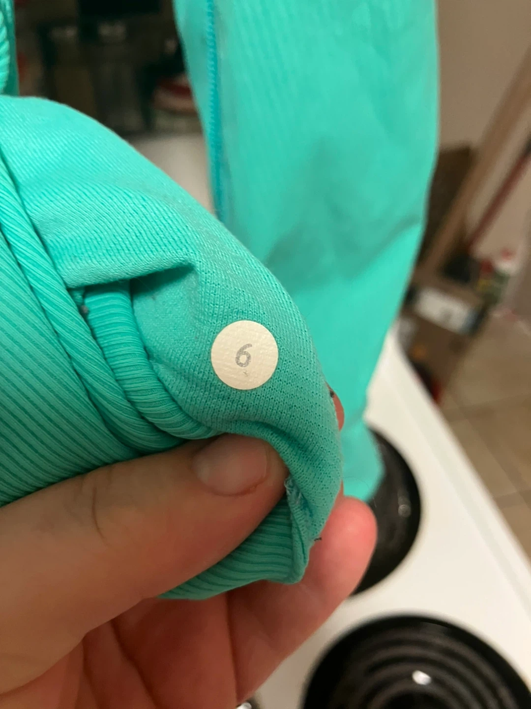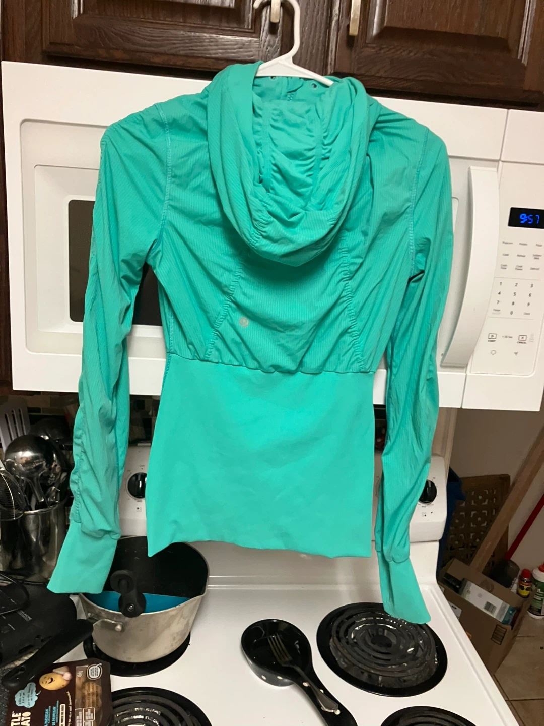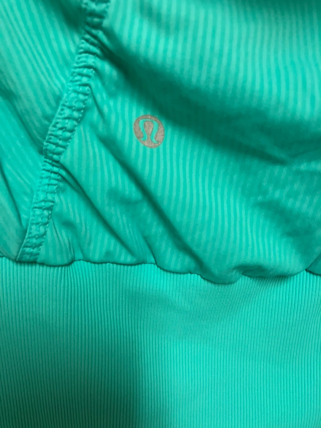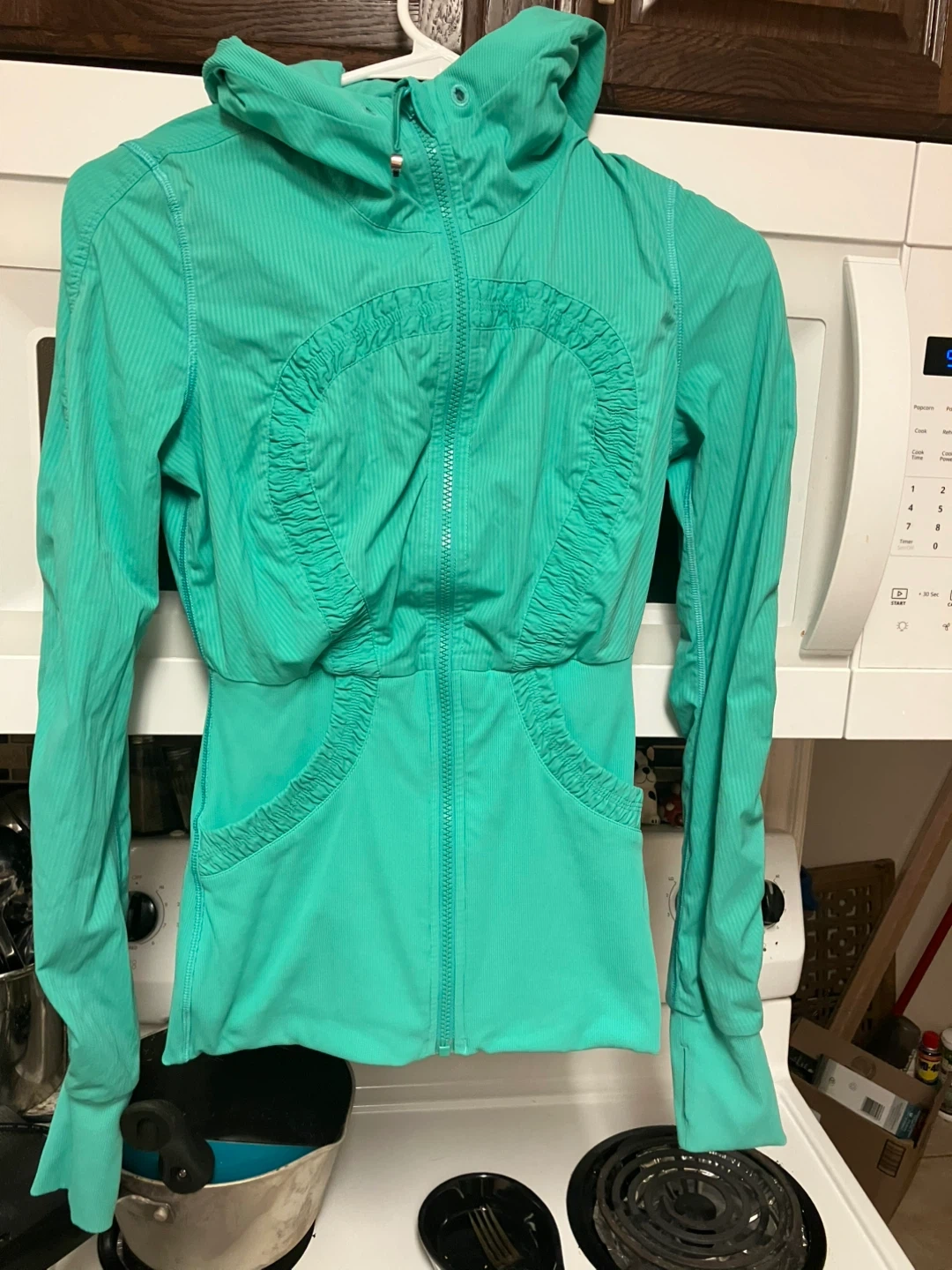 Selling a Lululemon jacket in a vibrant turquoise colour, size 6. It's in great condition and ready for a new home! Perfect for layering or wearing on its own during a light workout or casual outing