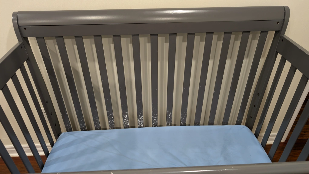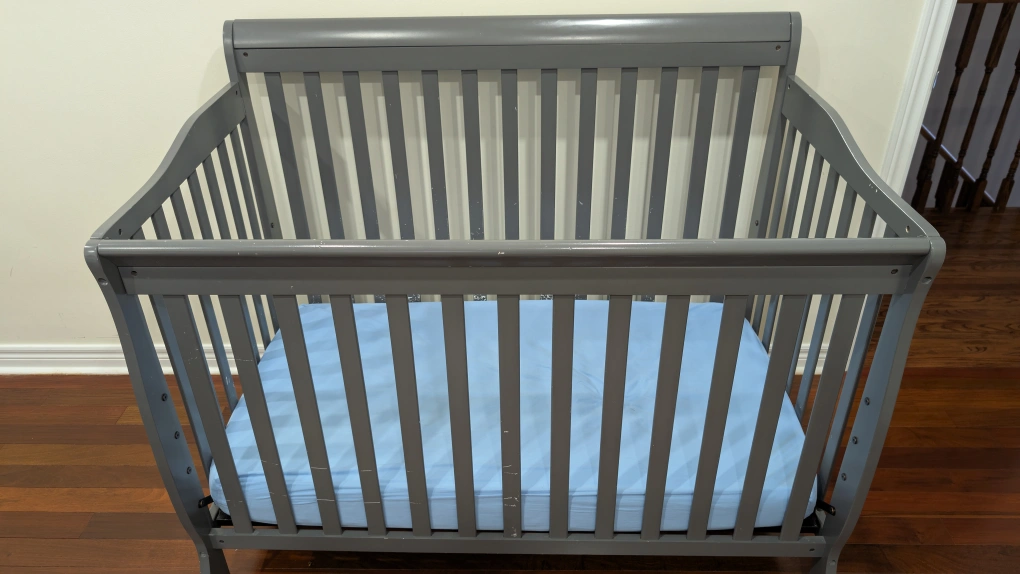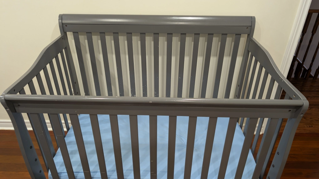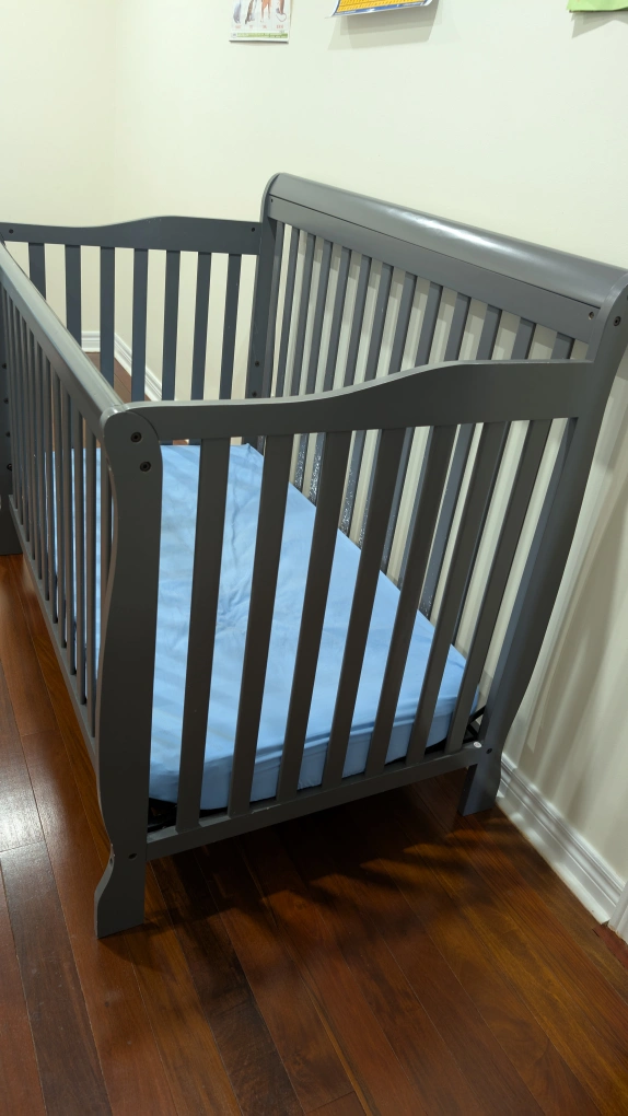 Selling a grey baby crib. It has some wear and tear, as shown in the photos.