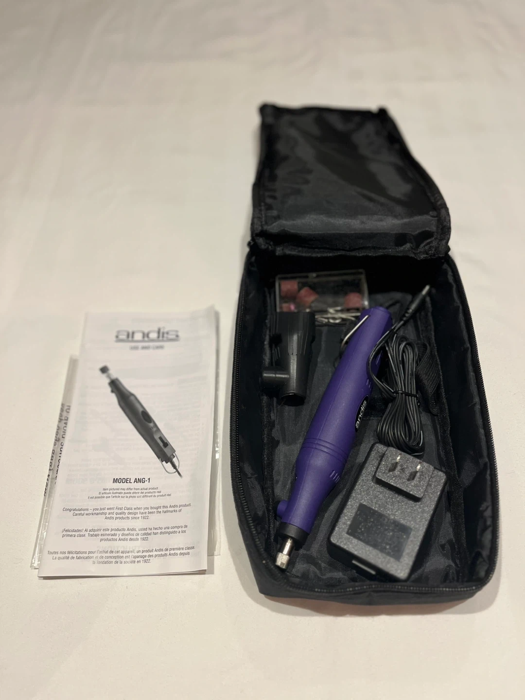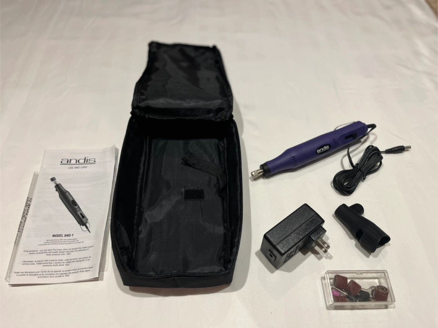 Brand New. Andis ANG-1 corded nail grinder kit for pets (purchased for my dog although never used). Full set in original soft case. It includes the nail grinder, power adapter, and several grinding attachments. Check out my other listings for pet/dog grooming tools. All brand new!