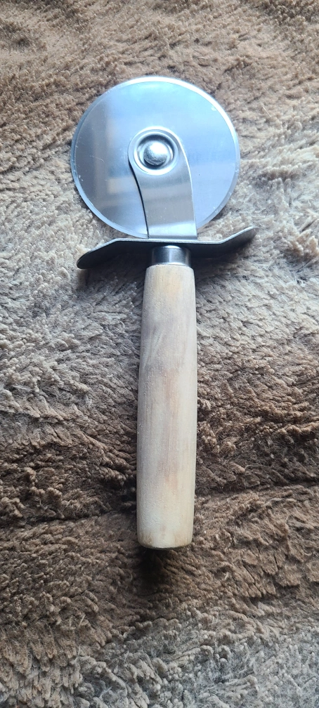 im giving away a small pizza cutter with a stainless steel blade and a wooden handle. Perfect for slicing up your homemade or takeout pizza!