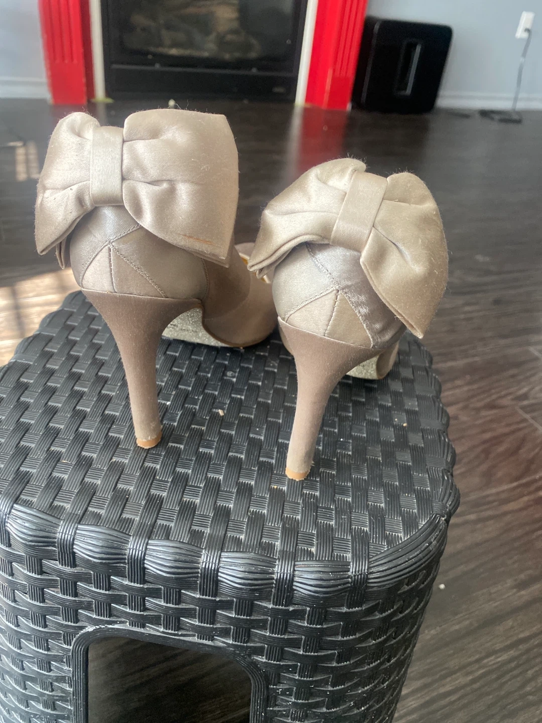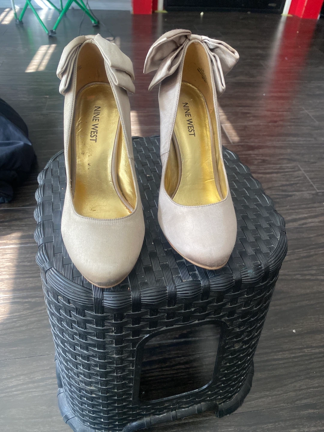 Nine West heels in a neutral colour. They are size 6M and have a cute bow detail on the back. Great for a night out!