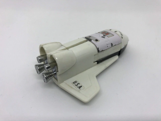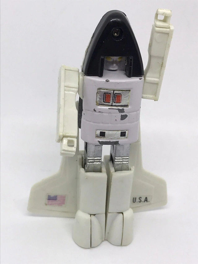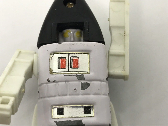 This is an early vintage variant of Mr Machine Robo or Spay-c. The stickers are unlike any others I have seen. The chest has Orange rectangles on a silver background. The belt is white like the rest of the body (some variants are made like this) Below the belt there are 2 black squares on a silver background. There is a USA flag sticker on one wing and USA on the other (similar to others I have seen but a different font) Maybe someone out there has seen this before and I will update the details. No tail fin / axe weapon No manufacturer markings Has some scratches/chips - sold as is