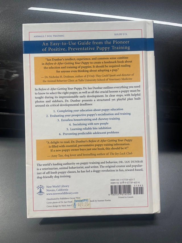 Excellent condition, like new. How to raise the perfect puppy. A revolution for dogs: Very few dog trainers have not been influenced by Dr. Ian Dunbar’s dog-friendly philosophy. Now, in Before and After Getting Your Puppy, Dr. Ian Dunbar combines his two popular puppy training manuals into one indexed, value-priced hardcover dog training book. In clear steps, with helpful photos and easy-to-follow puppy training milestones, he presents a structured yet playful and humorous plan for raising a wonderful dog. Fans of The Art of Raising a Puppy, Training the Best Dog Ever, or Zak George’s Dog Training Revolution, will love Ian Dunbar’s Before and After Getting Your Puppy.