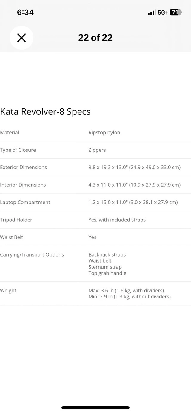 New Kata Revolver-8 PL camera backpack, crafted from durable ripstop nylon with exterior dimensions of 9.8 x 19.3 x 13.0 inches, ideal for carrying all your photography essentials. This backpack includes straps for a tripod, a waist belt for added support, and a dedicated laptop compartment, making it perfect for photographers on the go. It is in good condition. Here are some of its features: * Material: Ripstop nylon * Exterior Dimensions: 9.8 x 19.3 x 13.0 inches (24.9 x 49.0 x 33.0 cm) * Interior Dimensions: 4.3 x 11.0 x 11.0 inches (10.9 x 27.9 x 27.9 cm) * Laptop Compartment: 1.2 x 15.0 x 11.0 inches (3.0 x 38.1 x 27.9 cm) * Tripod Holder: Yes, with included straps * Waist Belt: Yes * Weight: Max 3.6 lb (1.6 kg, with dividers) / Min: 2.9 lb (1.3 kg, without dividers) New without tags Pickup can be arranged in Brampton, Mississauga, Oakville, Burlington, Hamilton https://www.dpreview.com/reviews/accessory-review-kata-revolver-8-backpack