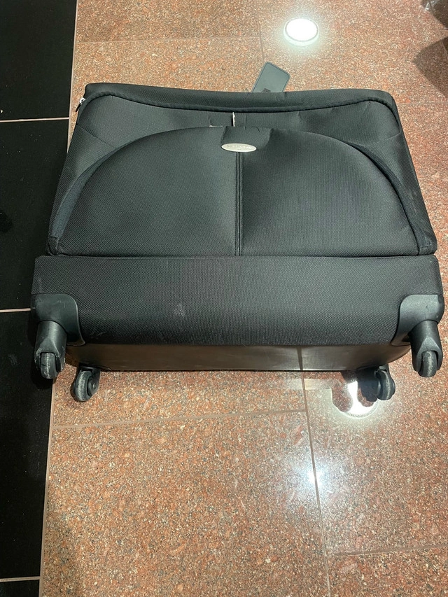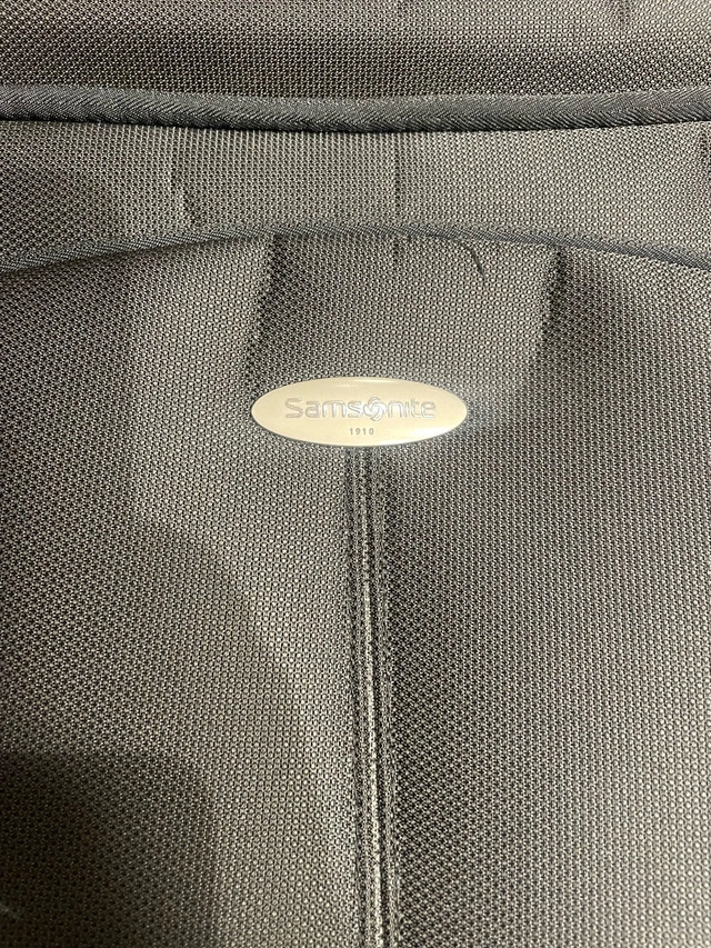 Samsonite Suit Carrier is perfect for keeping your suits and dresses wrinkle-free while traveling, featuring a convenient rolling four wheel design. The garment bag has multiple interior pockets and compression straps, ensuring your clothes stay organized and secure during transit. * Brand: Samsonite * Type: Rolling Suit Carrier * Colour: Black * Material: Durable Fabric * Features: Multiple interior pockets, compression straps, rolling spinner wheels, telescoping handle Dimensions: 24” wide x 22” tall and 10” deep at the bottom and it becomes narrower to about 8” at the top Condition: Used - Good