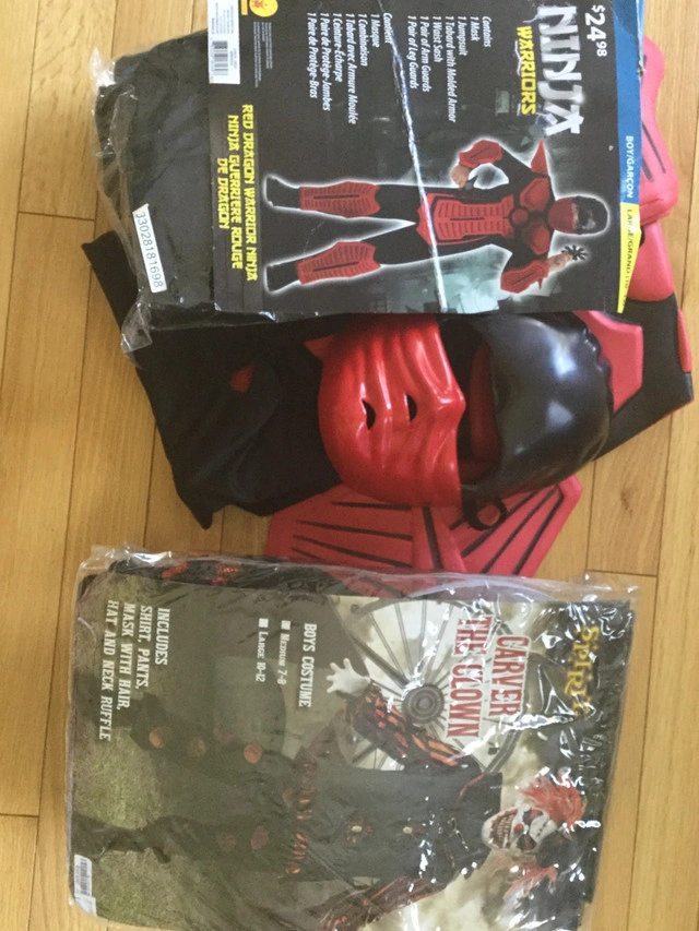 Halloween costumes- many sizes. See pictures Ghillie Suit - aged 12-14 - SOLD Storm trooper - aged 8-10 -$20 Hot dog zombie - aged 10 - $SOLD Clown - age7-8 - $20 Morph freaky Green - age 10-12 - SOLD Morph fright slender man - age 10-12 $20 Ninja - age 10-12 $20 W Werewolf - age 7-8 $15 zombie creeper with mask - size 12-14 -$20 Skeleton outfit robe - size 8-10 no mask $10 Green on black skeleton size 8-10 $10 SWAT - fits teenager - $20 Skeleton black top fits teenager - $15 For Sale By: Owner