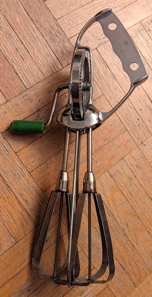 Mix your ingredients the old-fashioned way with this vintage hand crank mixer! This mixer features a durable construction and a comfortable green handle. It's in good working condition, ready to help you whip up delicious treats. When picking up, visitors parking in the back of building.