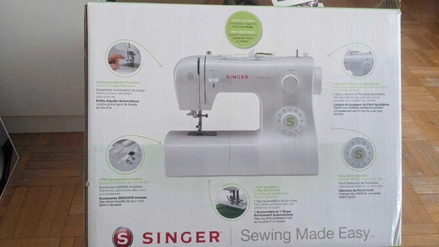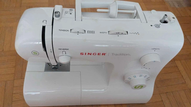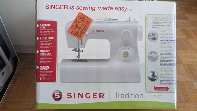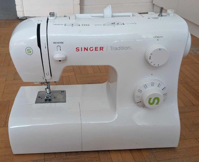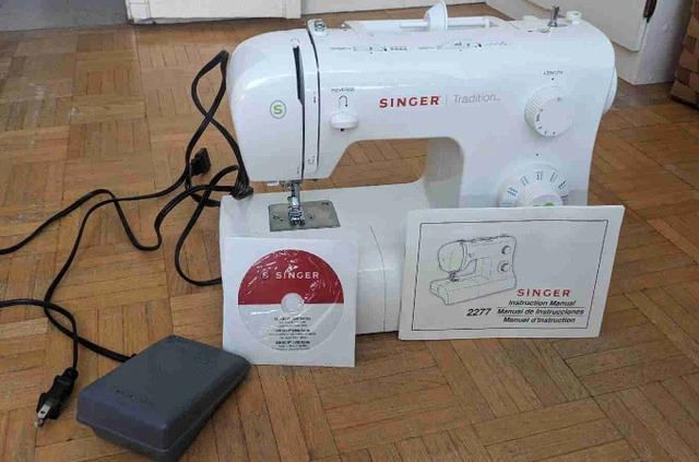 This is a Singer Tradition 2277 sewing machine perfect for basic sewing tasks and repairs. I have owned it for a few years, and it is still in good working condition. Non smoking home. Here are the specs: * Model: Singer Tradition 2277 * Type: Mechanical * Stitch options: Built-in stitches including basic, stretch, and decorative stitches * Bobbin: Front-loading * Adjustable stitch length * Automatic four-step buttonhole * Free arm for sewing cuffs and sleeves Whether you're hemming pants or creating a masterpiece, this sewing machine will get the job done. And, of course, if you're reading this, it's still available! When picking up, visitors parking in the back of building.