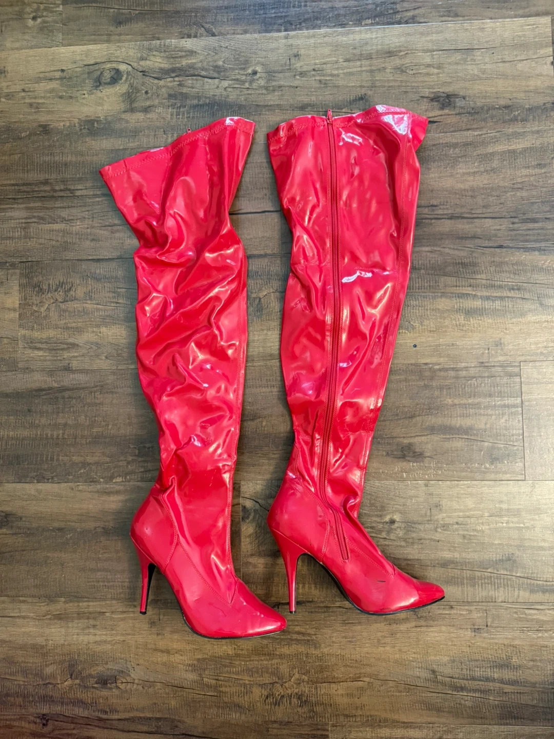 Selling a pair of red thigh high boots. They have a stiletto heel and a zipper closure. Perfect for a night out! Used for drag, I’m a men’s 9 foot.