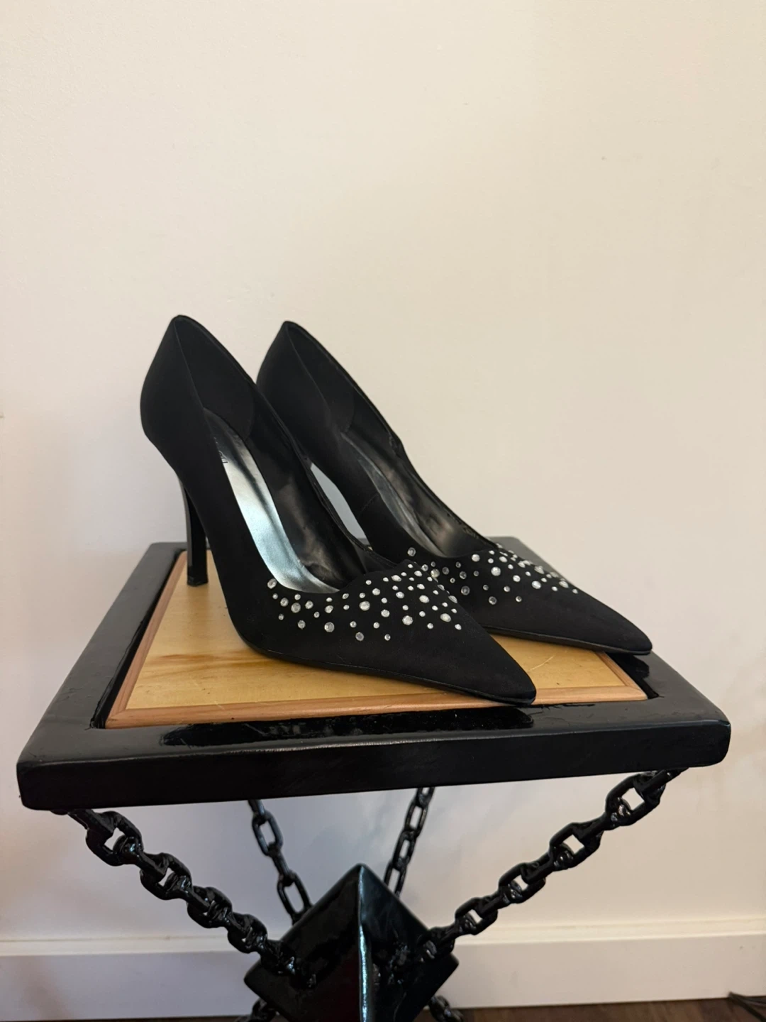 Selling a pair of elegant black heels! They feature a pointed toe and are adorned with sparkling rhinestones, adding a touch of glamour to any outfit Size 10