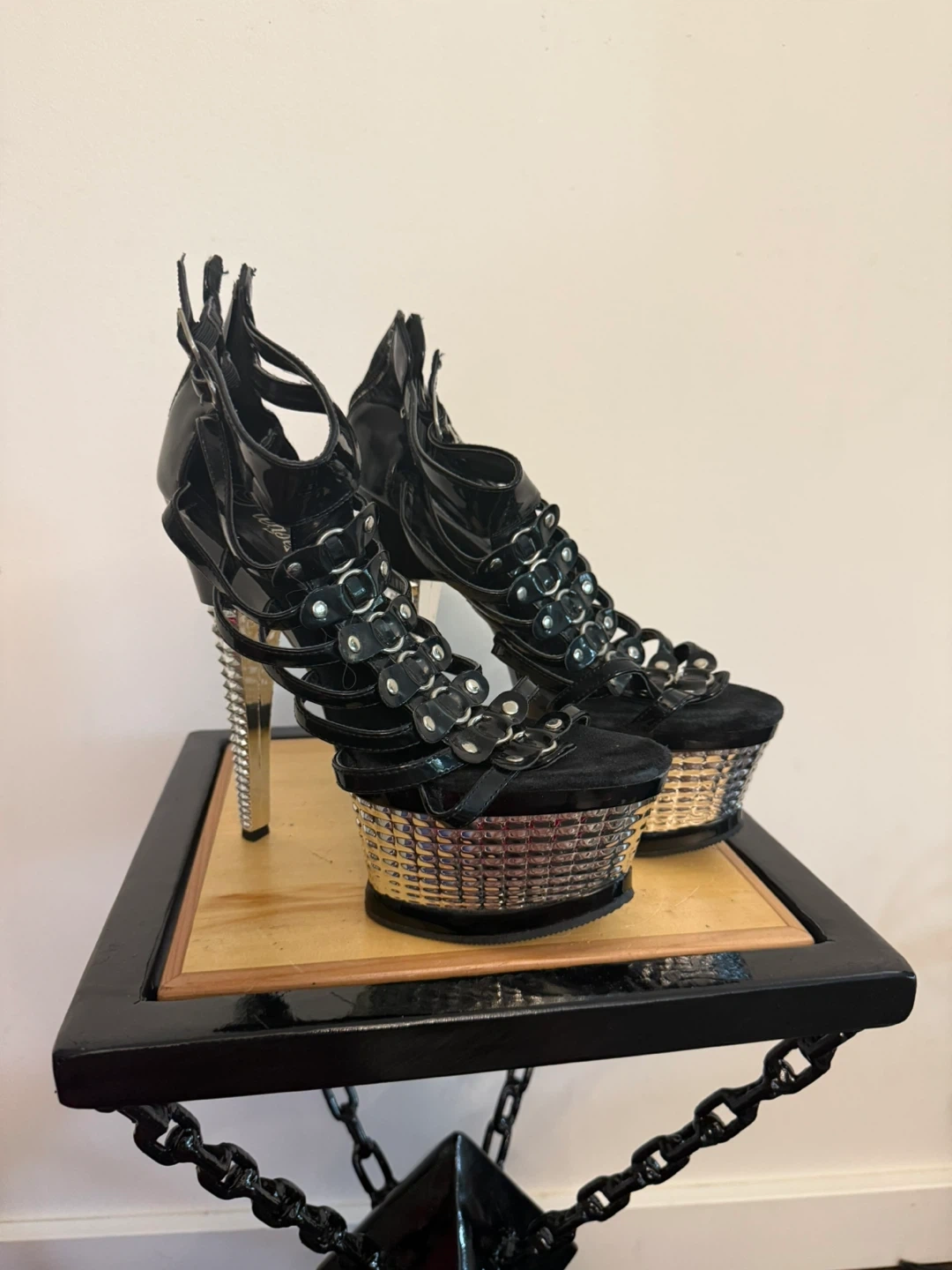 These black platform heels are sure to make a statement! They have a unique design with silver accents and a strappy upper. Perfect for a night out or adding some edge to your look