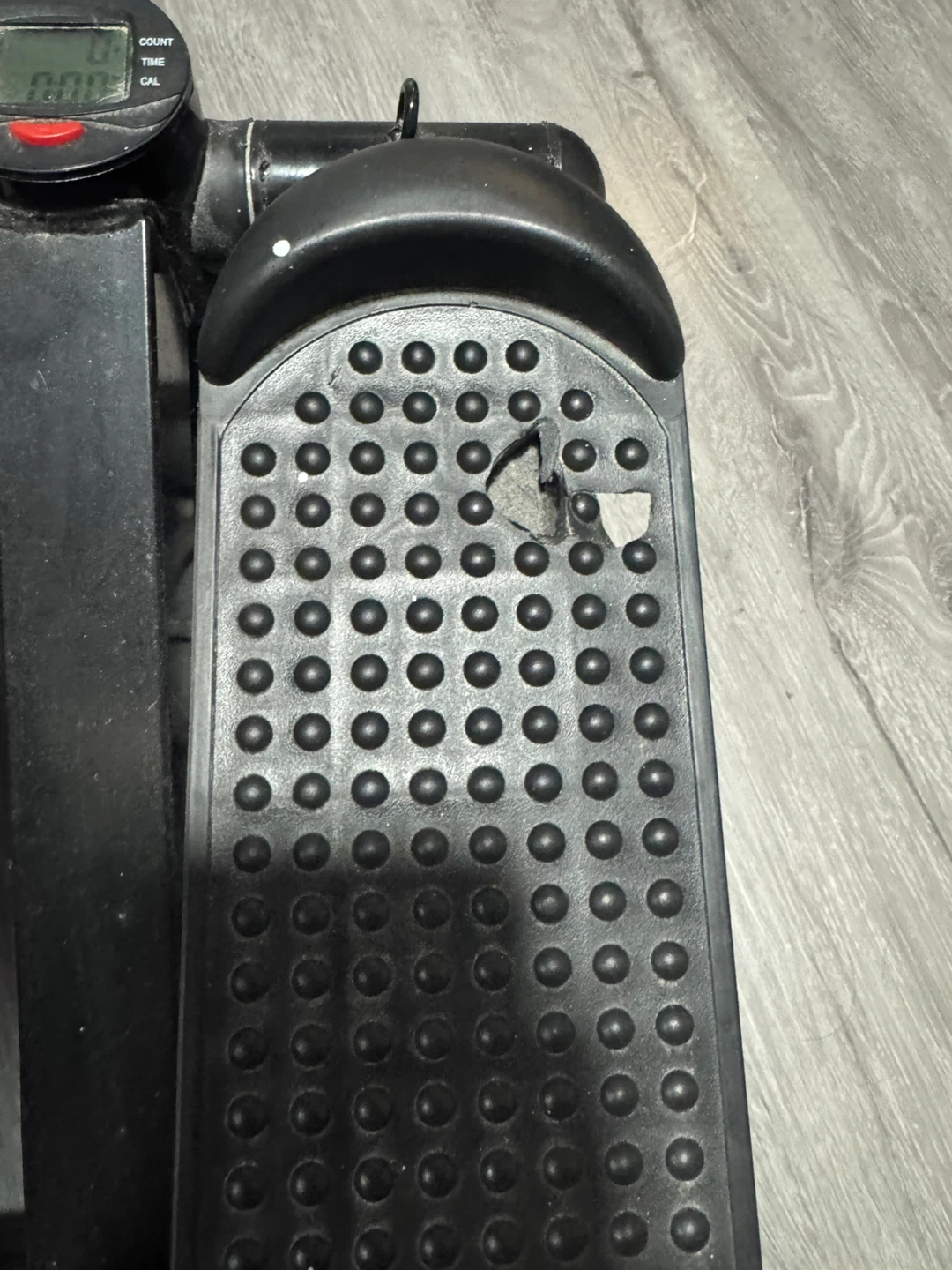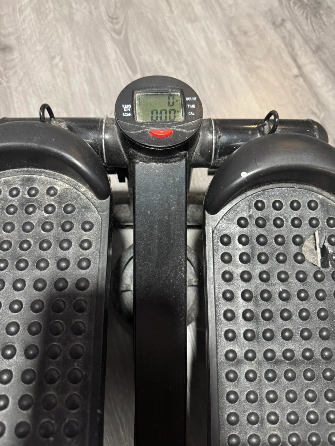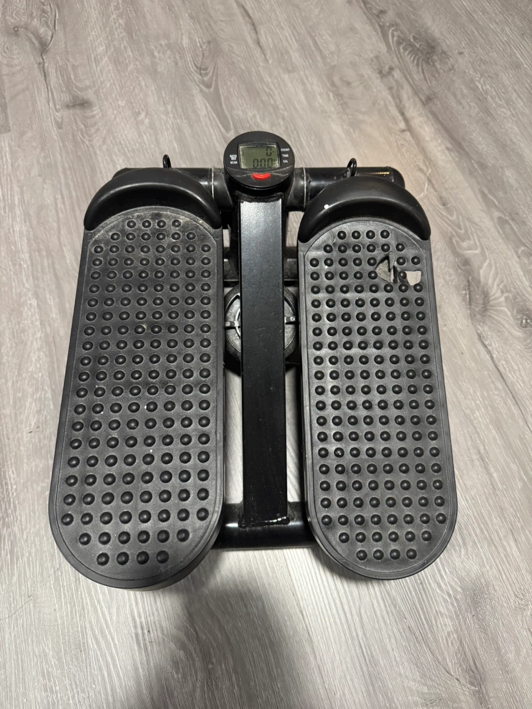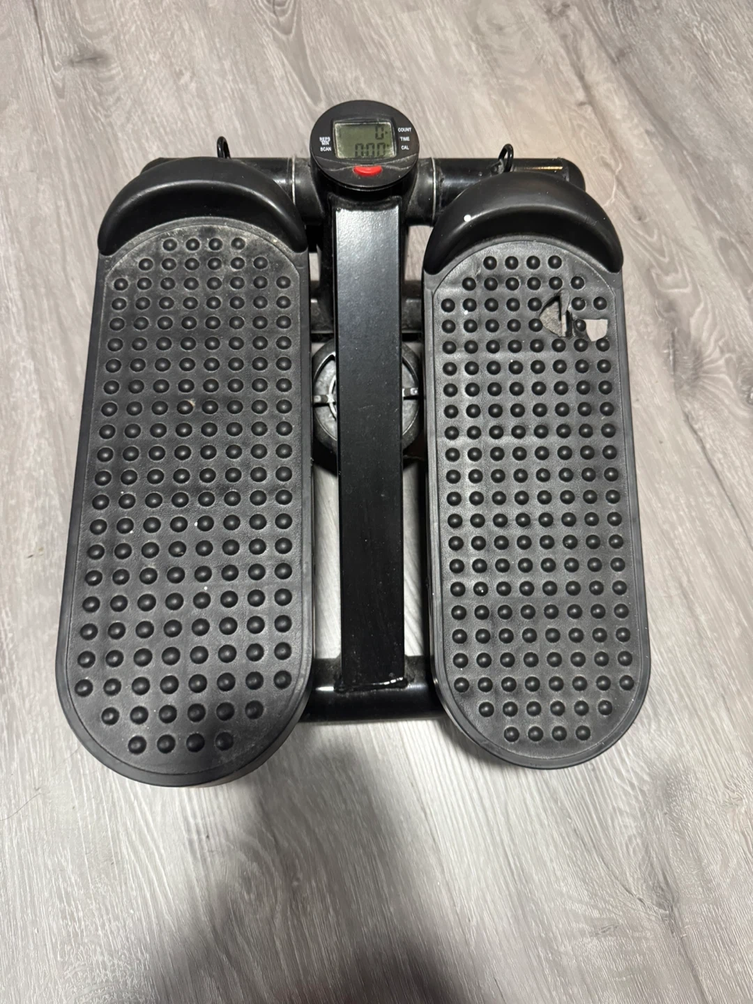 Selling a mini stepper in black. It has a small digital display that shows count, time, and calories. There is some minor cosmetic wear on one of the foot platforms, but it's fully functional and ready for a new home!