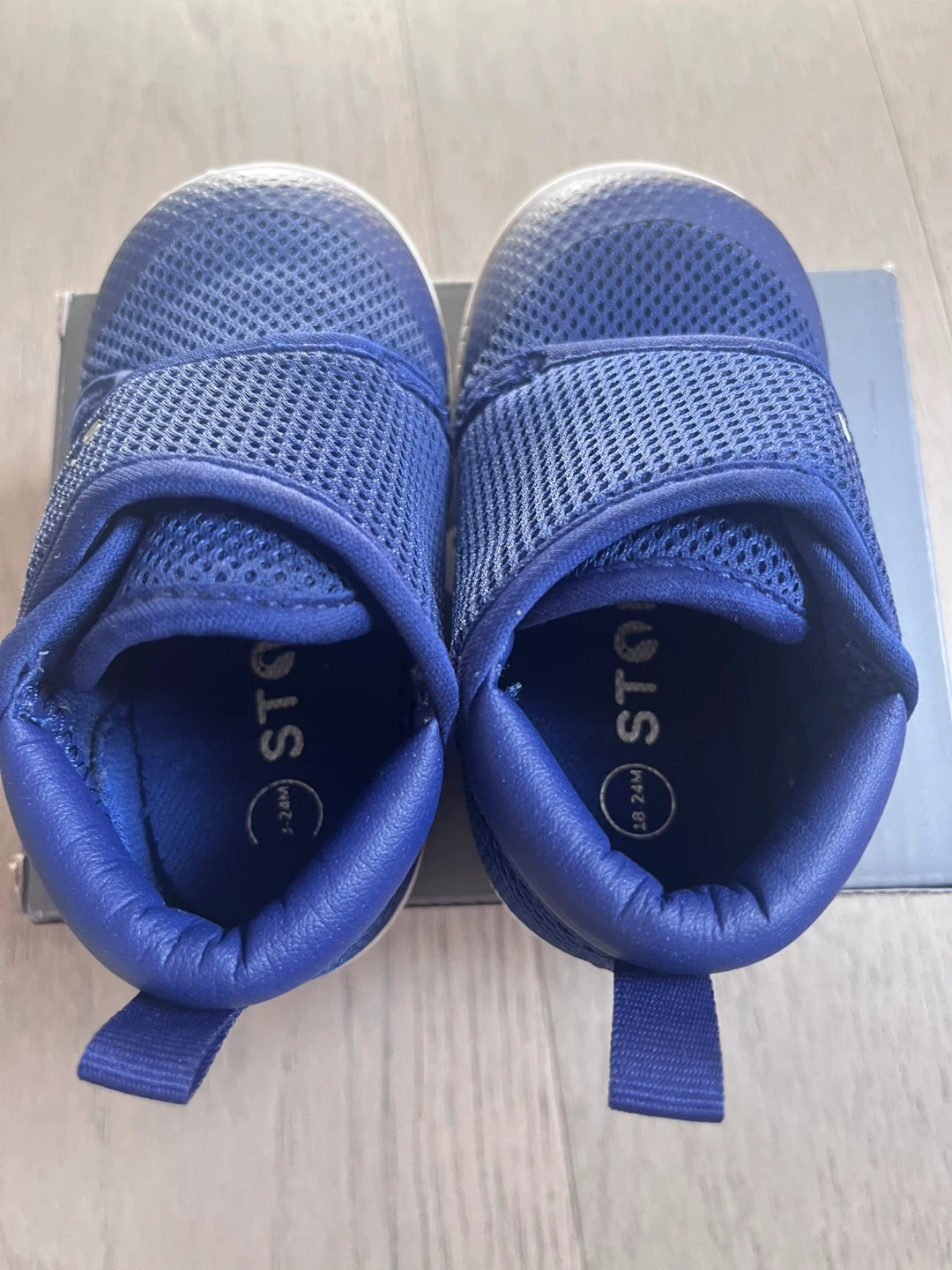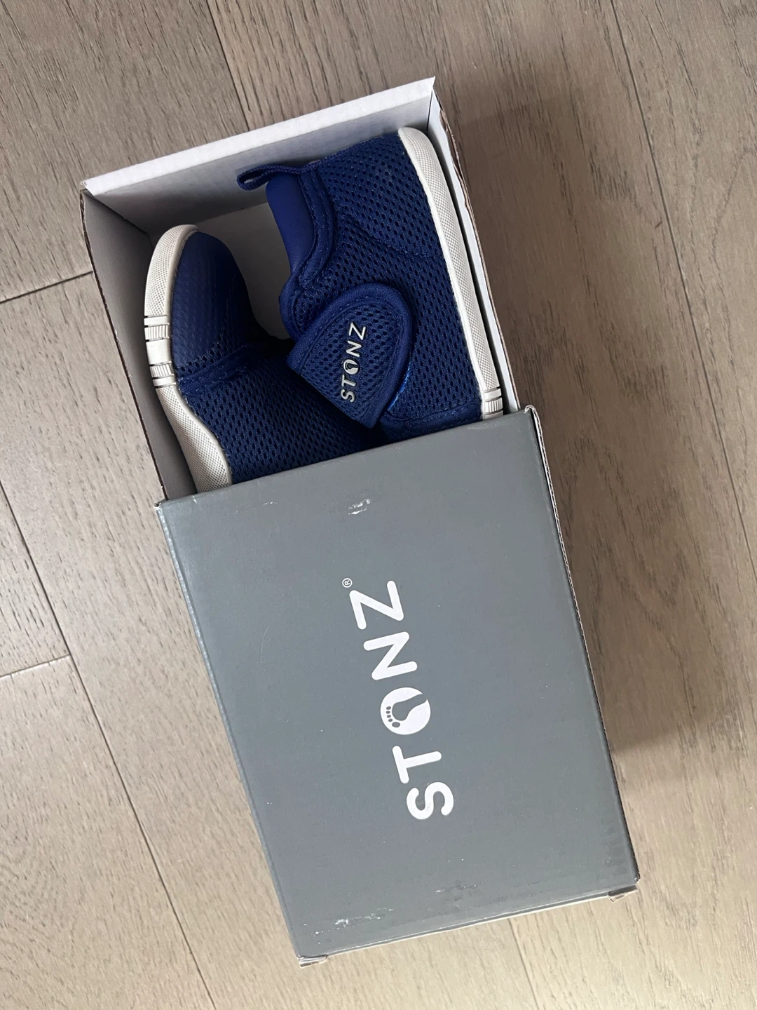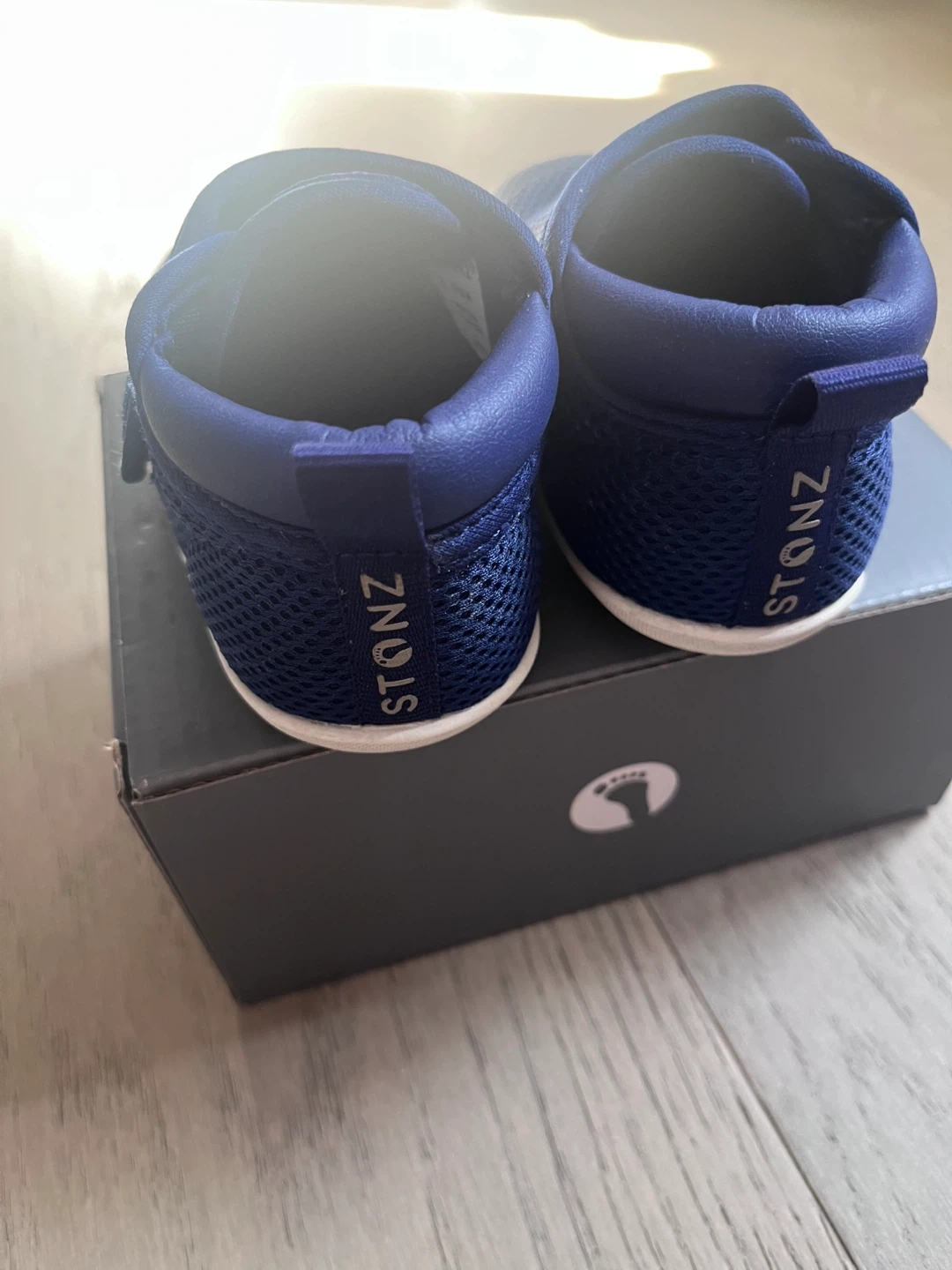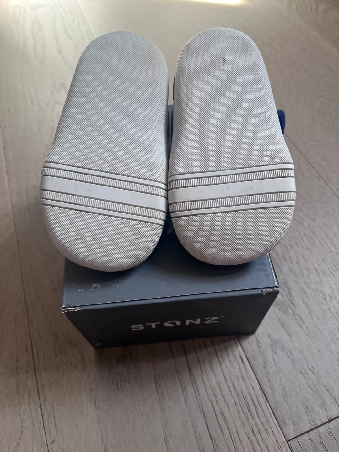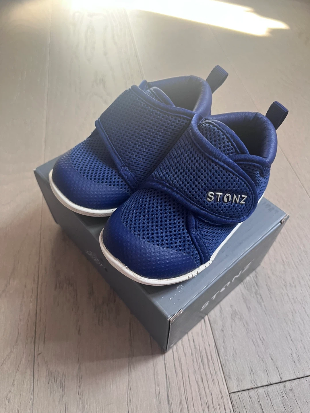 The best toddler shoes by STONZ! In great condition and comes with the original box! They're perfect for toddlers aged 18-24 months. These shoes have a velcro strap and are super easy to put on and take off. The white soles show a little bit of dirt from minimal wear, but the rubber and dark blue shoe materials are all in perfect condition. Ask for more photos or info. Retails for $55. The Cruiserâ„¢ Original Baby is thoughtfully designed to support early walkers as they take their first steps. Featuring a breathable 95% polyester and 5% elastane air mesh upper, it keeps little feet cool and comfortable during active play. The zero-drop sole and wide toe box promote natural alignment, balance, and healthy foot development, while the flexible natural rubber outsole offers slip-resistant traction and durability. With its easy-on hook and loop closure, this shoe ensures a secure fit that stays in place, even during wiggly moments. Machine washable and crafted with hypoallergenic, low-VOC materials, the APMA-recognized Cruiserâ„¢ Original Baby is a safe, reliable choice for little ones learning to explore their world.