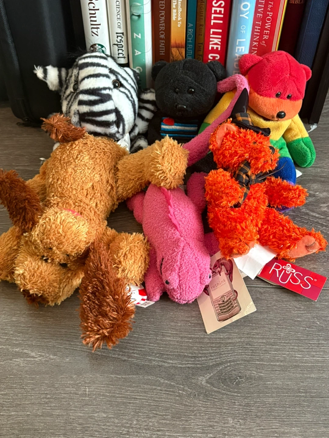 Selling a collection of Russ plush toys! There's a variety of cute characters including a zebra, bears, a dog, and even a pink dinosaur. All in great condition and ready for a new home! 3 are brand new with tags - $5 each The other 3 are lightly used 2$ each or 3 for $5