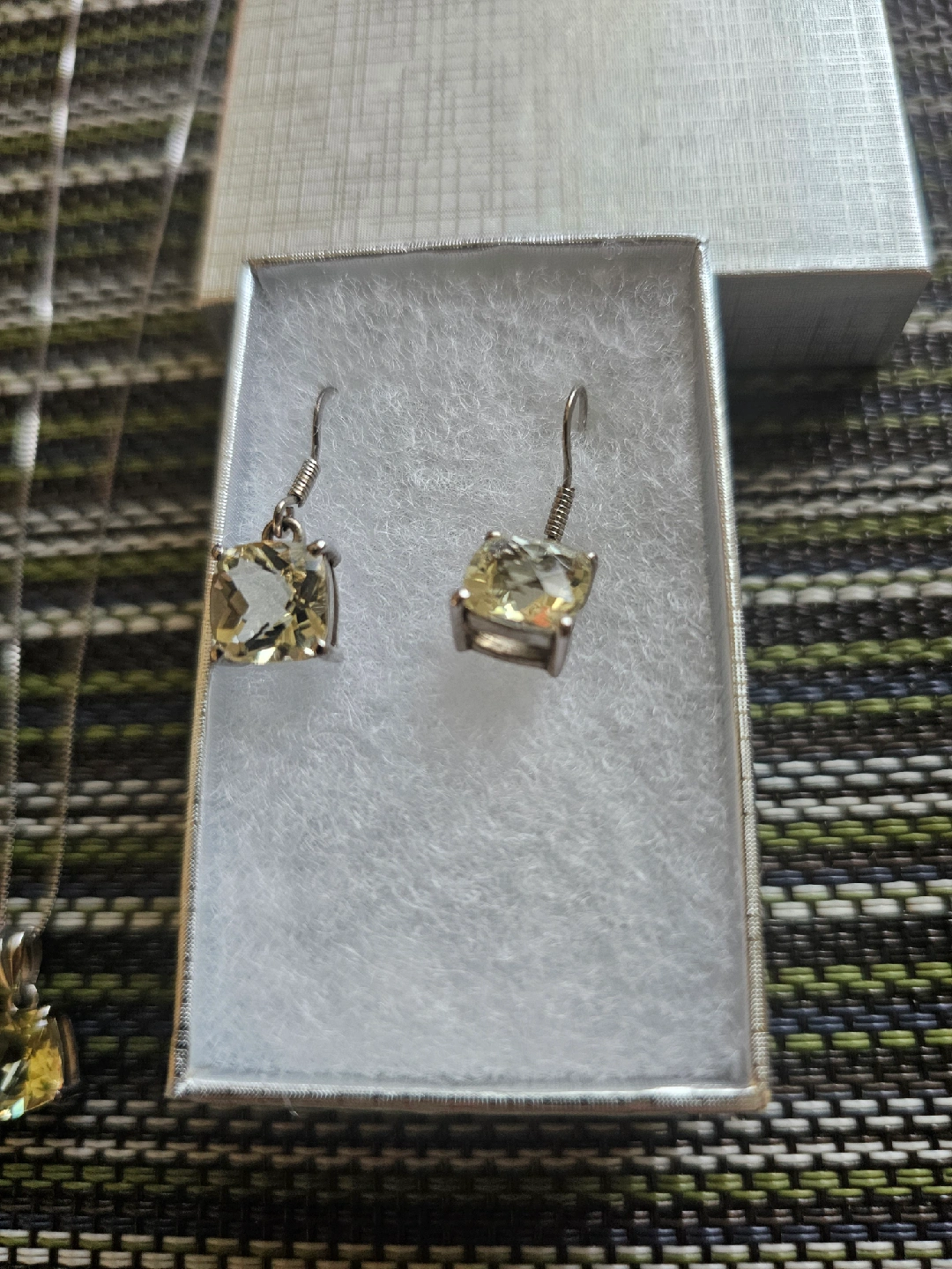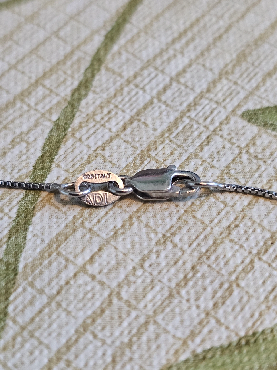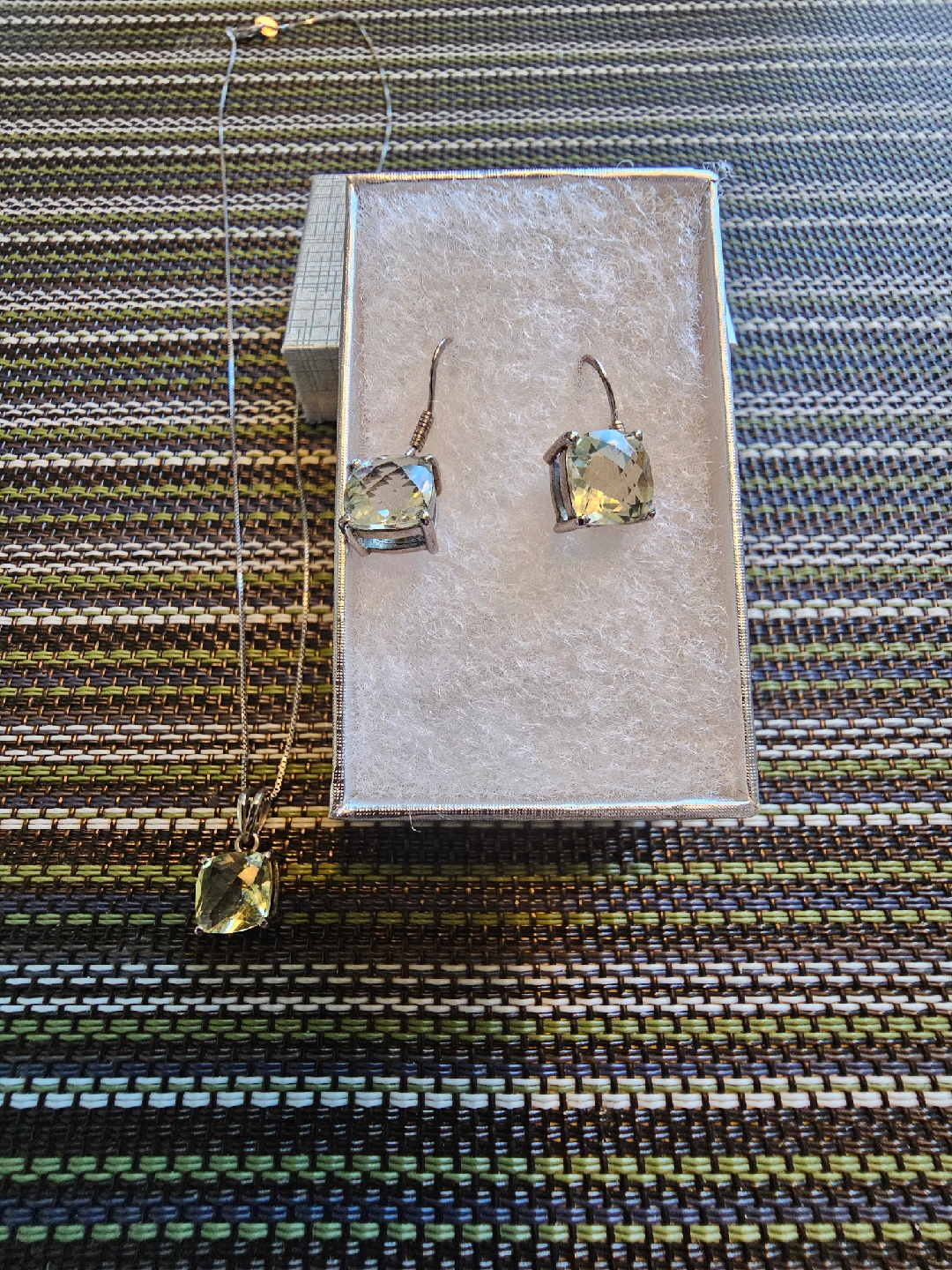 Here's a lovely ADI 925 sterling silver necklace and earrings set! The set features a delicate chain necklace with a pendant and matching earrings, all with a beautiful light green stone. Comes in a box, perfect for gifting or keeping safe