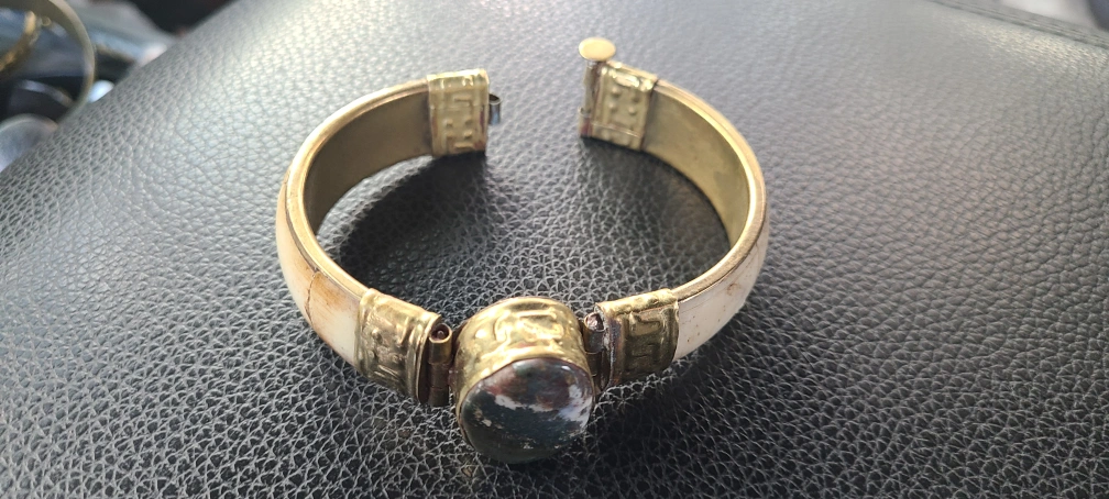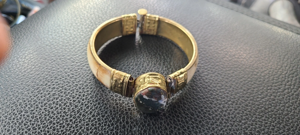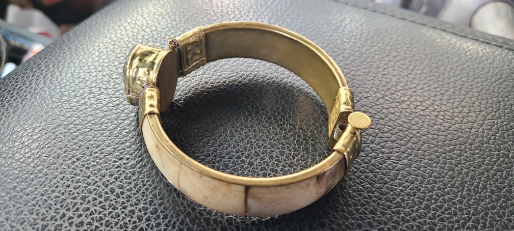 Selling a vintage bangle bracelet. It features a brass band with bone inlay and a stone accent. It's a unique piece that would add some character to any outfit!
