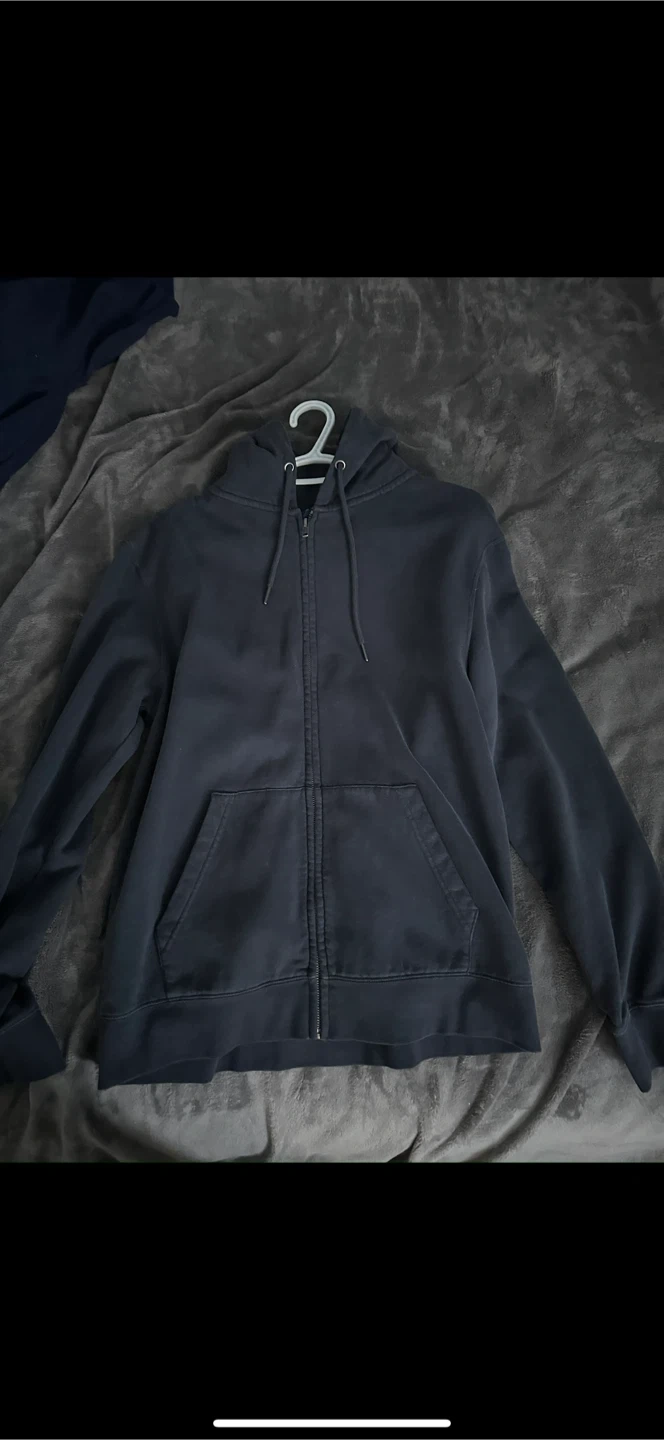 A navy blue full zip hoodie is up for grabs! It's in great condition only worn once
