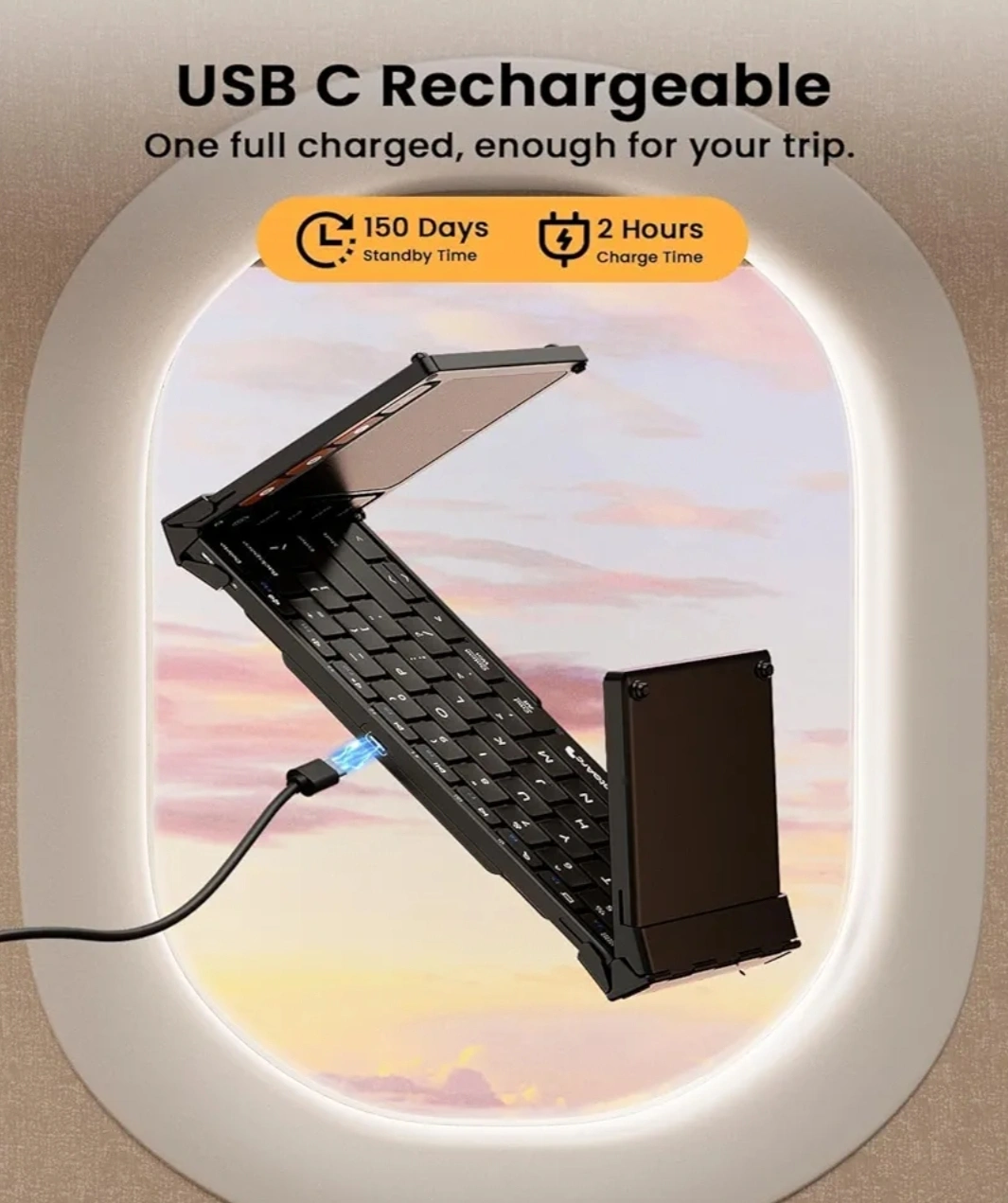 Amazon price is $68 New in Box Selling for $35 Foldable Keyboard with Trackpad: This portable keyboard has a multi-touch trackpad that perfectly adapts to Windows or IOS system, and has various trackpad gestures, providing a comfortable usage experience while clicking, scrolling, and swiping through content effortlessly. Very convenient for your typing, watching, working and carrying without a mouse needed (Note: for iPad and iPhone users, please turn on the "AssistiveTouch" function on your device first. Some gesture functions may not work for reasons related to the application itself. Besides, you can set the scroll direction on on your device) Tri-fold Portable Keyboard: Our bluetooth travel keyboard is designed with tri-fold and compact enough for carry. 88-key standard size keys with QWERTY layout, trackpad and entire row of shortcut keys, you can type quickly and accurately on a laptop-like keyboard, making your work easier and more productive Portable for Travel: The collapsible keyboard can be folded into a small size (8.46 x 4.68 x 0.78 inch) for taking on the go. Come with phone stand and small PU leather bag specially designed for this travel keyboard. It effortlessly fits into your handbag, an ideal companion for your travels, coffee shop visits, business trips, flights, and more (Warm note: We recommend using the keyboard on flat surface because the fold hinge can not be locked such as on your knees) Sync Up to 3 Devices: 3 Bluetooth 5.1 channels provides user-friendly workflow solutions. Suitable for small mobile devices such as iPad iPhone Steam Deck Android phones or tablets, also works well on desktop devices such as laptops, computers with bluetooth. Widely compatible with Android, Windows, iPad OS, Mac OS, iOS, etc (WarmTip: Only connect via Bluetooth, and Type C cable just for charging). Type C Rechargeable: Built in powerful 300 mAh battery, the fold up keyboard allows standby time last 120 days. It will enter sleep mode after 60 minutes of inactivity to save power, you can press any key to activate and use. When not in use, fold up the keyboard to turn off(unfold to power on) Warm Tip: Without an angle on the back for the purpose of prioritizing its slim and portable features, cater to the specific requirements of a travel-friendly keyboard.