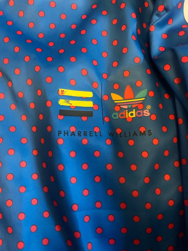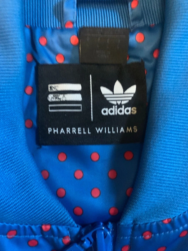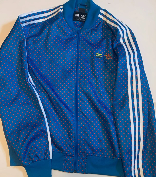 send offers Brand: Adidas Collaboration: Pharrell Williams Colour: Blue with red polka dots Design: Classic track jacket with three-stripe detail Condition: Used - Good Size: Medium For Sale By: Owner Cash accepted: Yes