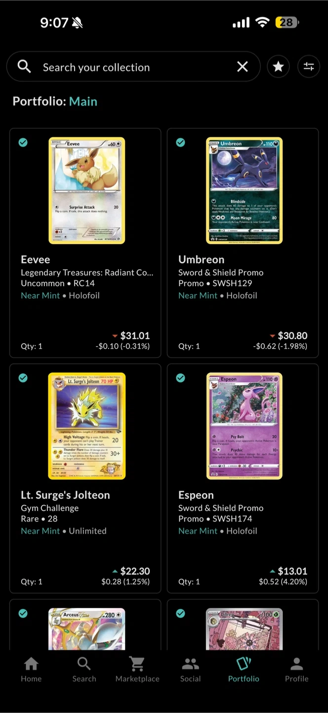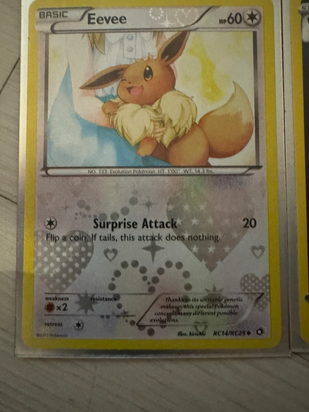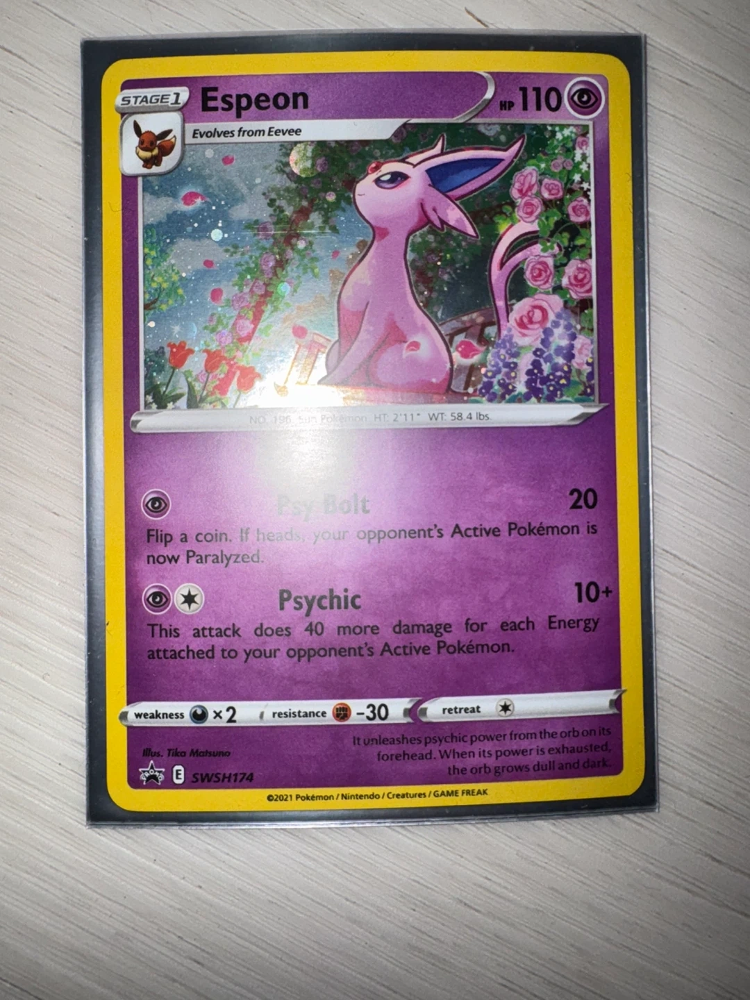 Selling a set of Pokemon cards including Eevee (Legendary Treasures Radiant Collection RC14), Umbreon (Sword & Shield Promo SWSH129), Espeon (Sword & Shield Promo SWSH174), and Lt. Surge's Jolteon (Gym Challenge 28). Great for collectors! Pricing according to Collectr (not $5)