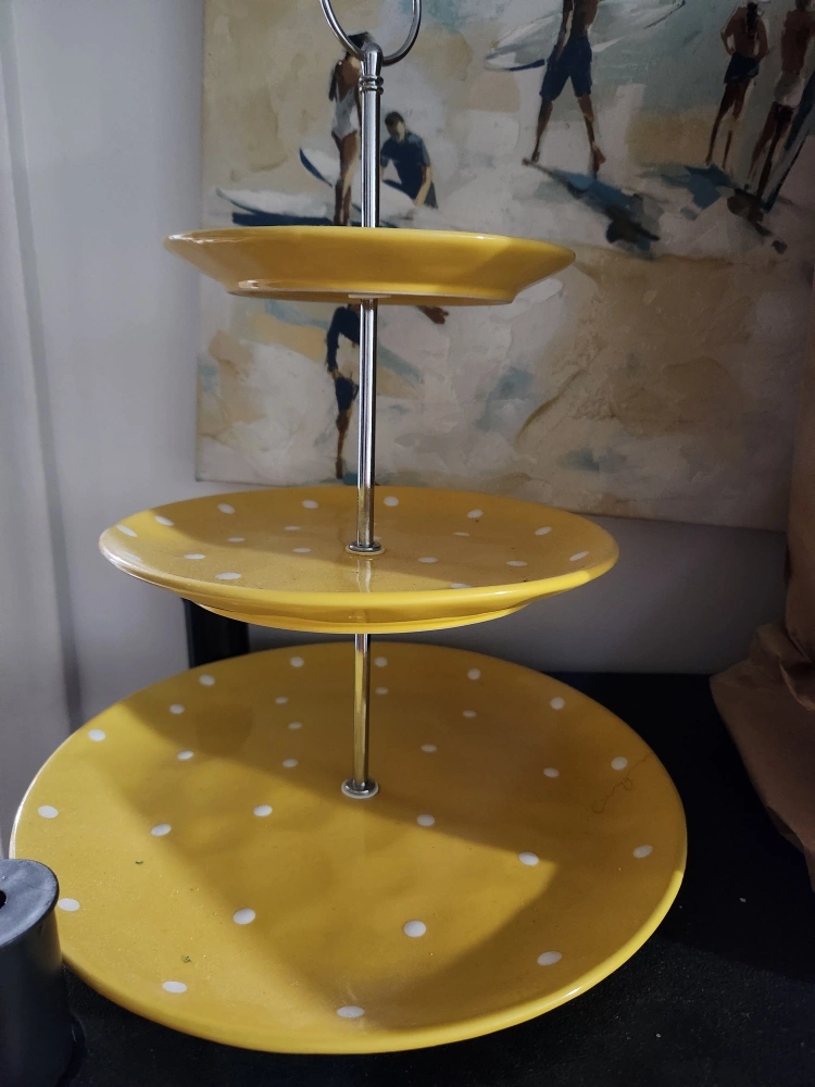 Add a touch of charm to your next gathering with this adorable 3-tiered dessert stand! It's perfect for displaying cupcakes, cookies, or any other treats you'd like to showcase. The bright yellow colour with white polka dots is sure to brighten up any table setting. It's in great condition and ready to find a new home!