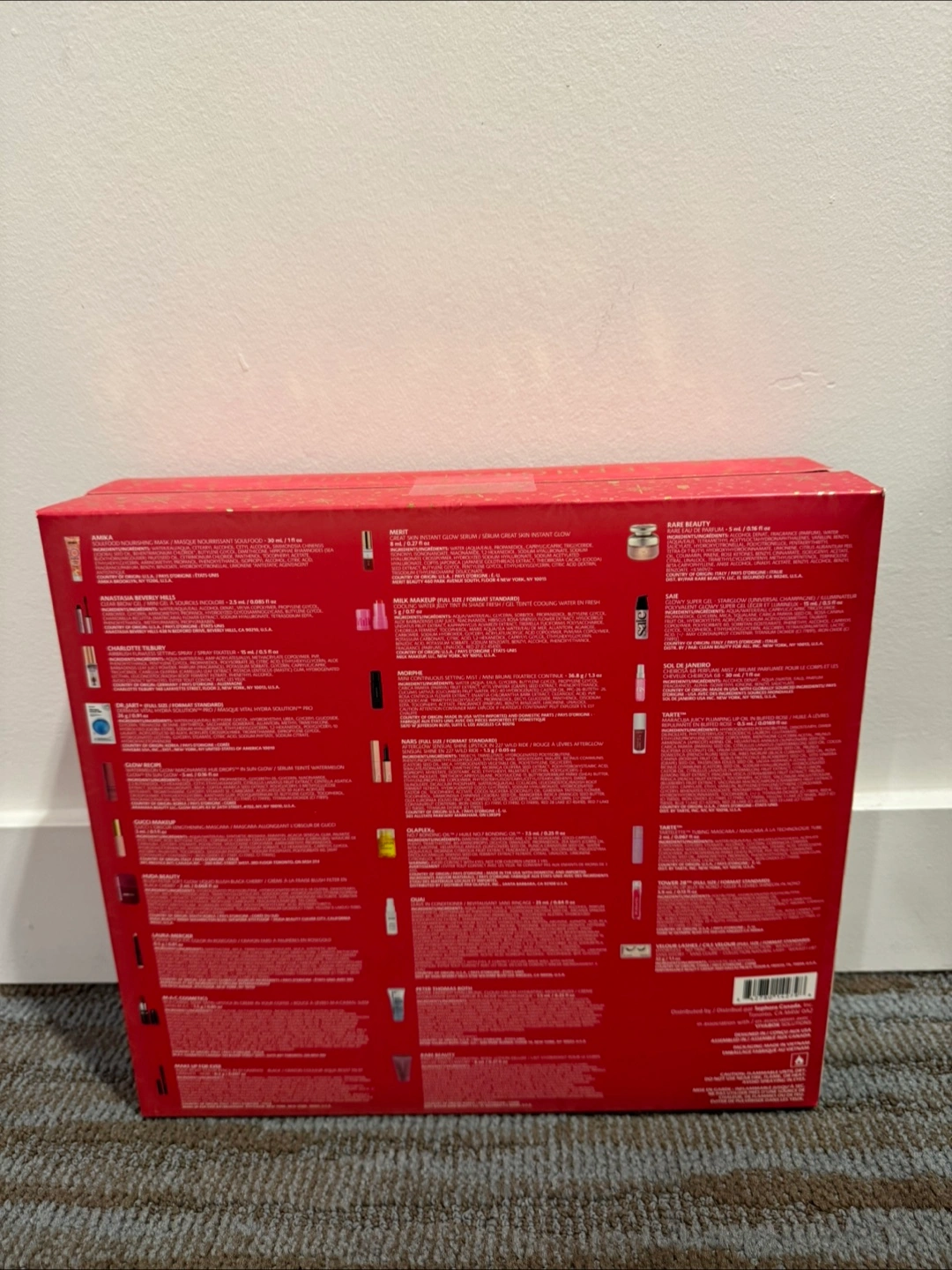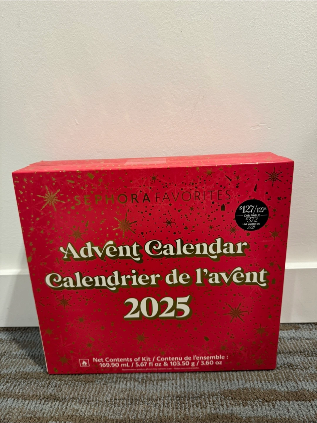 2025 Sephora Advent Calendar holiday limited edition Pickup in Vancouver What it is: A 25-piece kit featuring a variety of must-have products from hair and skincare to makeup and fragrance. What Else You Need to Know: This Advent Calendar includes a variety of must-have products from hair and skincare to makeup and fragrance, all from your favorite brands. This Set Contains: - 1 fl oz/ 30 mL amika Soulfood Nourishing Hair Mask (mini) - 0.0085 fl oz/ 2.5 mL Anastasia Beverly Hills Clear Brow Gel Flexible Medium-Hold Eyebrow Setter (mini) - 0.5 fl oz/ 15 mL Charlotte Tilbury Airbrush Flawless Hydrating & Waterproof Setting Spray (mini) - 0.91 fl oz/ 26 g Dr. Jart+ Vital Hydra Solution PRO Glow Face Mask with Hyaluronic Acid (full size) - 0.16 fl oz/ 5 mL Glow Recipe Watermelon Glow Niacinamide Hue Drops Serum in Sun Glow (mini) - 0.1 fl oz/ 5 mL Gucci L'Obscur Lengthening Mascara in Eve Black (mini) - 0.068 fl oz/ 2 mL HUDA BEAUTY Blush Filter Soft Glow Liquid Blush in Black Cherry (mini) - 0.01 oz/ 0.5 g Laura Mercier Caviar Stick Cream Eyeshadow in Rosegold (mini) - 0.01 oz/ 0.5 g MAC Cosmetics M·A·CXIMAL Sleek Stain Lipstick in Crème In Your Coffee (mini) - 0.05 oz/ 1.5 g MAKE UP FOR EVER Aqua Resist Color Pencil Eyeliner in Graphite (mini) - 0.007 oz/ 0.2g MERIT Great Skin Instant Glow Serum with Niacinamide and Hyaluronic Acid (mini) - 0.17 oz/ 5 g MILK MAKEUP Cooling Water Jelly Tint Lip + Cheek Blush Stain in Fresh (full size) - 1.3 oz/ 36.8 g Morphe Mini Continuous Setting Mist (mini) - 0.05 oz/ 1.5 g NARS Afterglow Sensual Shine Hydrating Lipstick in Wild Red (mini) - 0.25 fl oz/ 7.5 mL Olaplex No. 7 Bonding Frizz Reduction & Heat Protection Hair Oil (mini) - 0.84 fl oz/25 mL OUAI Detangling and Frizz Fighting Leave In Conditioner (mini) - 0.25 fl oz/ 7.5 mL Peter Thomas Roth Water Drench Hyaluronic Cloud Rich Barrier Moisturizer (mini) - 0.27 fl oz/ 8 mL Rare Beauty by Selena Gomez Find Comfort Niacinamide Hydrating Body Lotion (mini) - 0.16 fl oz/5 mL Rare Beauty by Selena Gomez Rare Eau de Parfum with Vanilla and Caramel (mini) - 0.5 fl oz/ 15 mL Saie Glowy Super Gel Lightweight Dewy Multipurpose Illuminator in Starglow (mini) - 1 fl oz/ 30 mL Sol de Janeiro Cheirosa 68 Beija Flor Hair & Body Perfume Mist (mini) - 0.0169 fl oz/ 0.5 mL tarte Maracuja Juicy Lip Plumping Oil with Hyaluronic Acid in Buffed Rose (mini) - 0.067 fl oz/ 2 mL tarte Tartelette Lengthening & Tubing Mascara in Black (mini) - 0.13 fl oz/ 3.9 mL Tower 28 Beauty ShineOn Lip Jelly Hydrating Non-Sticky Lip Oil in XOXO (full size) - 1.1 oz/ 32 g Velour Lashes Effortless - No Trim - Natural Lash Collection in Would I Lie? (full size)