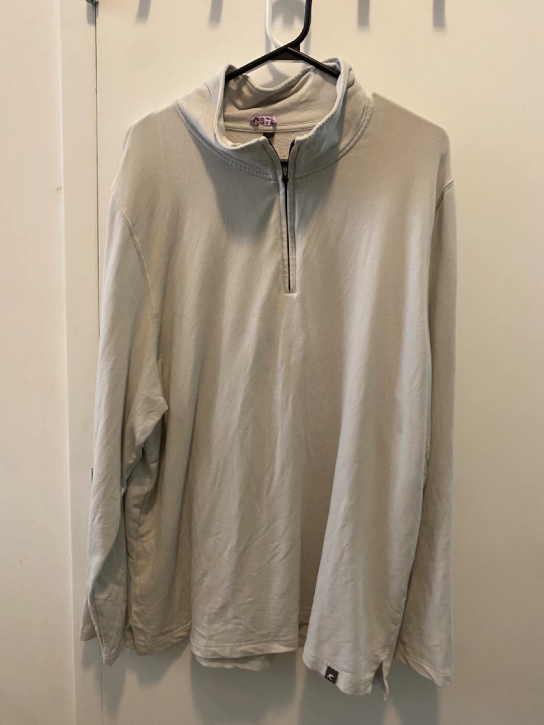 Selling a light beige 1/4 zip pullover. It's in great condition! The material is soft and comfortable, perfect for layering or wearing on its own during cooler days. It has a minimalist design with a small logo near the hem.