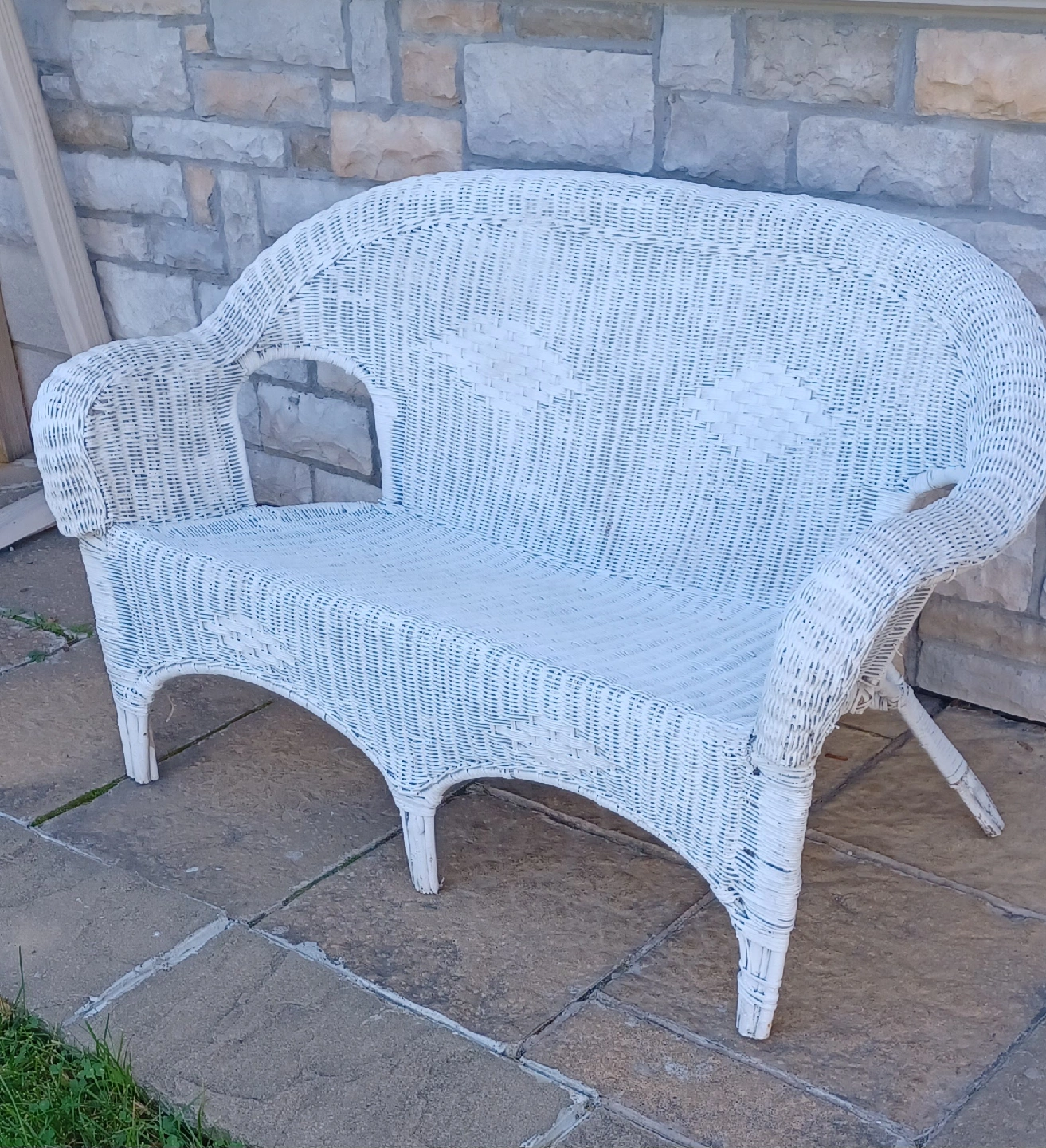 Selling a charming white wicker loveseat bench. It's perfect for adding a touch of classic style to your porch, garden, or sunroom. The bench is made of durable wicker material and is in good condition. It's a great spot to relax and enjoy the outdoors! dimension approximately 52" long.