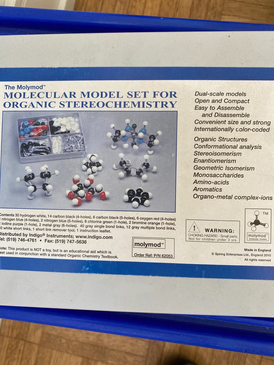 Selling a Molymod molecular model set for organic stereochemistry. It's a dual-scale model that's open, compact, and easy to assemble and disassemble. It's conveniently sized and strong, with internationally colour-coded parts. Contents include: 30 hydrogen white, 14 carbon black (4-holes), 6 carbon black (5-holes), 6 oxygen red (4-holes), 4 nitrogen blue (4-holes), 2 nitrogen blue (5-holes), 8 chlorine green (1-hole), 2 bromine orange (1-hole), 2 iodine purple (1-hole), 2 metal gray (6-holes), 40 gray single bond links, 12 gray multiple bond links, 50 white short links, 1 short link remover tool, and 1 instruction leaflet