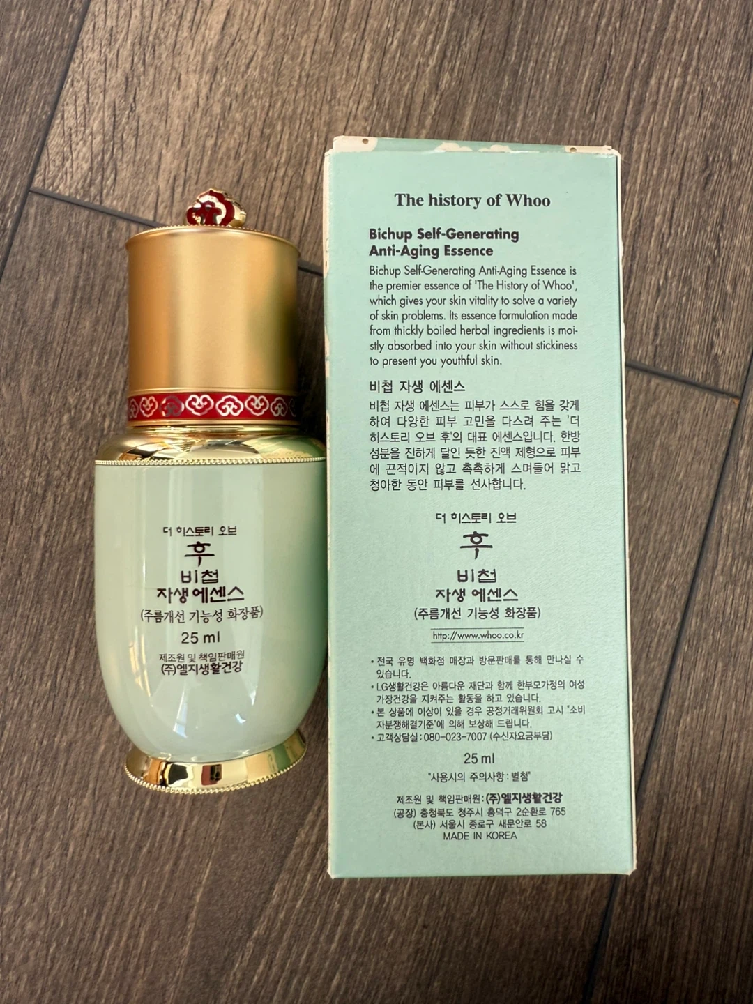 Selling The History of Whoo Bichup Self-Generating Anti-Aging Essence. This essence is designed to give your skin vitality and improve its overall condition. It's a lightweight formula that absorbs quickly without any stickiness, leaving your skin feeling smooth and youthful. It comes in the original box and contains 25ml of product