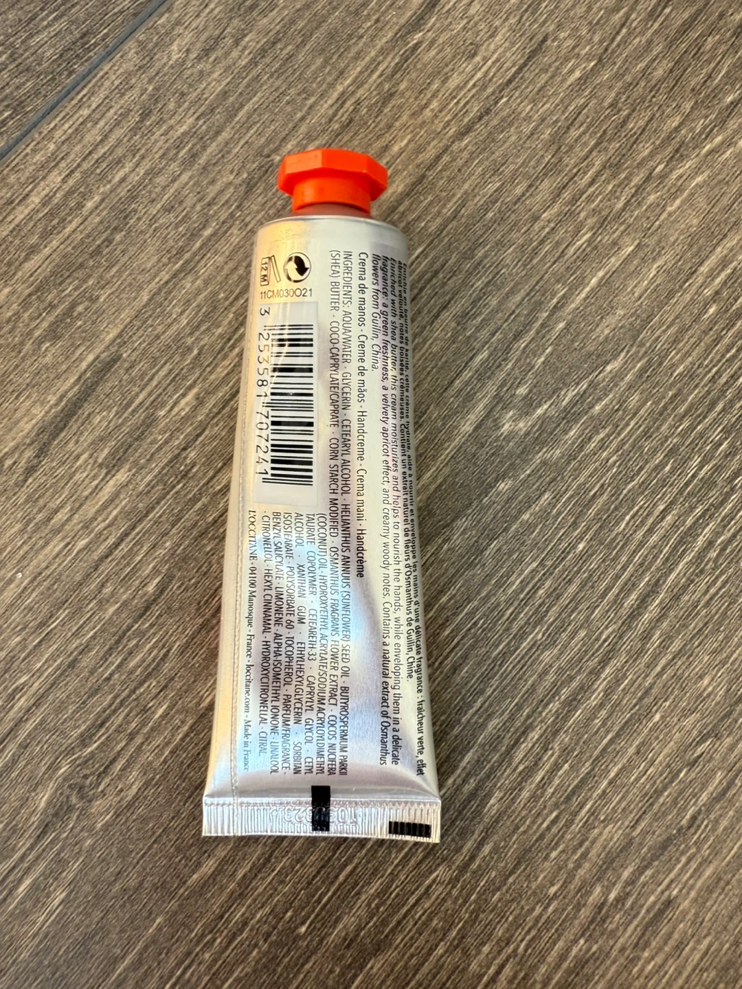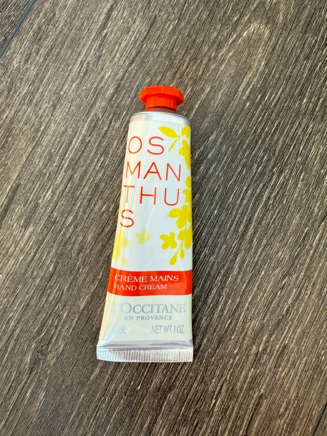 Selling a L'Occitane Osmathus hand cream. It's a 30ml tube, perfect for keeping your hands moisturized on the go. It's a lovely hand cream that will help to nourish the hands with a delicate floral scent of Osmanthus