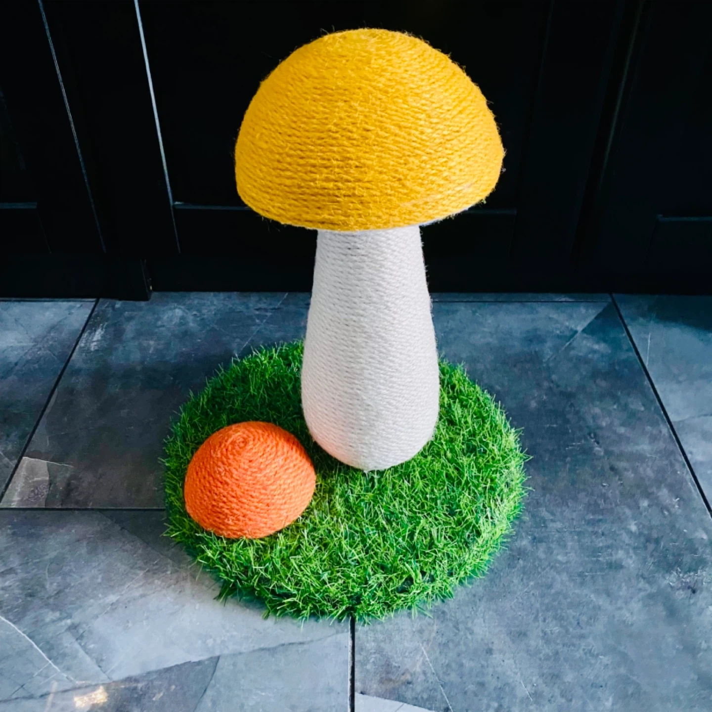 Adorable mushroom-shaped cat tree / scratcher. It has a yellow top, white stem, and a green base. There's also a small orange mound for extra playtime fun. New, no box. Easy to disassemble, two simple Allen screws under base (see last pic). Purchased for my hamsters playpen but sadly, he died before the playpen was finished. Hopefully your cat will enjoy this π Measurements: 14.5 inches tall 12 inches wide #pets #cats #scratchers #toys #decor