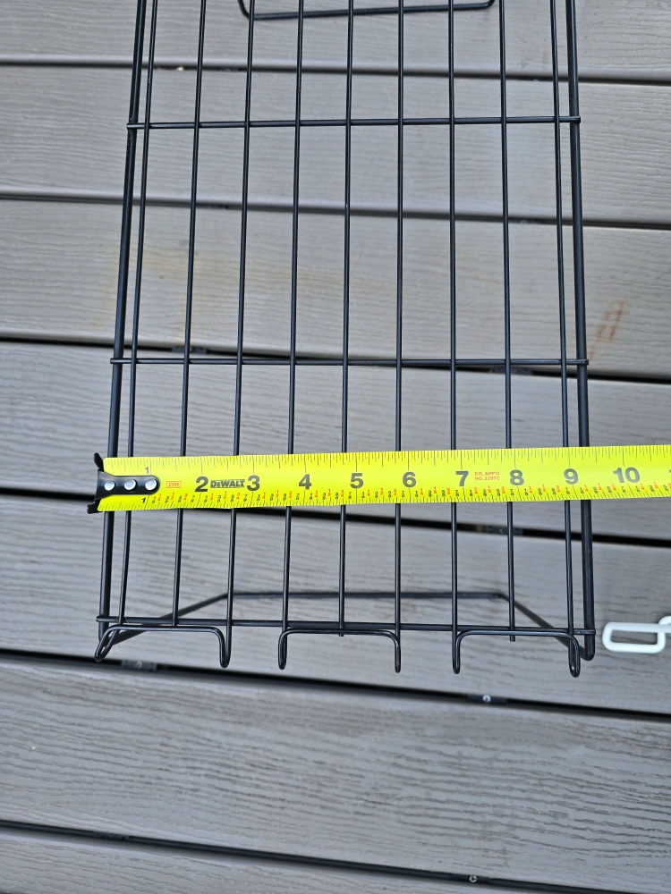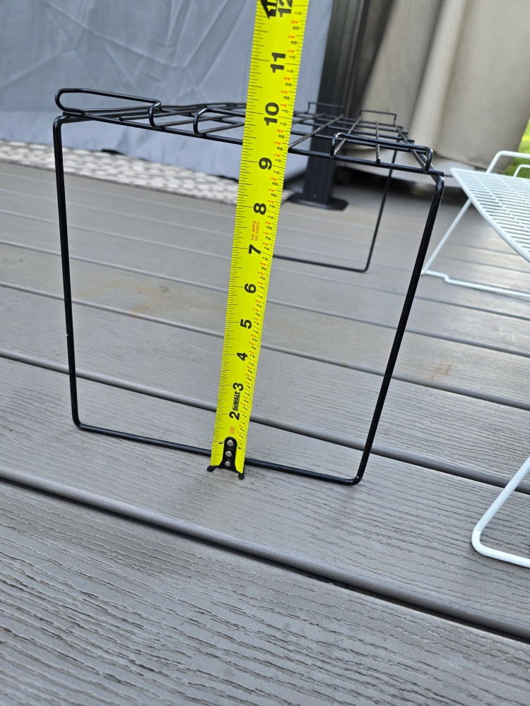 I'm selling a black wire shelf organizer. It's in great condition and perfect for adding some extra storage space. The shelf is approximately 10 inches wide and 11 inches tall.