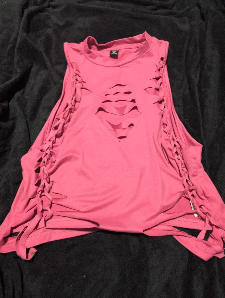 Selling a cute pink sleeveless top with a unique distressed design! It features cut-out details on the front and braided accents along the sides. Perfect for adding a bit of edge to your wardrobe