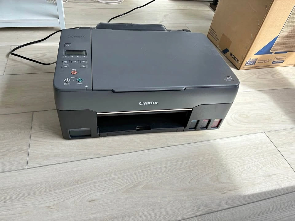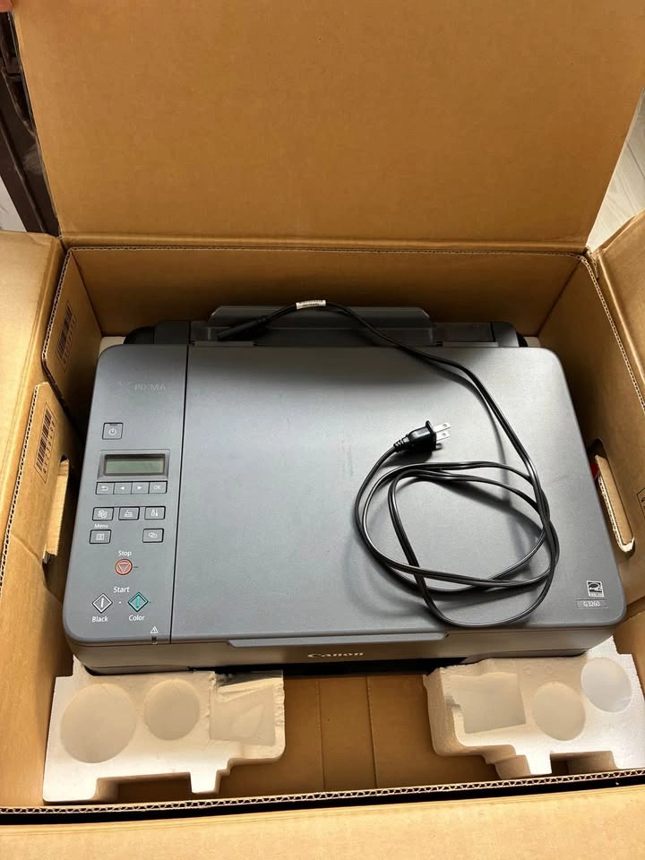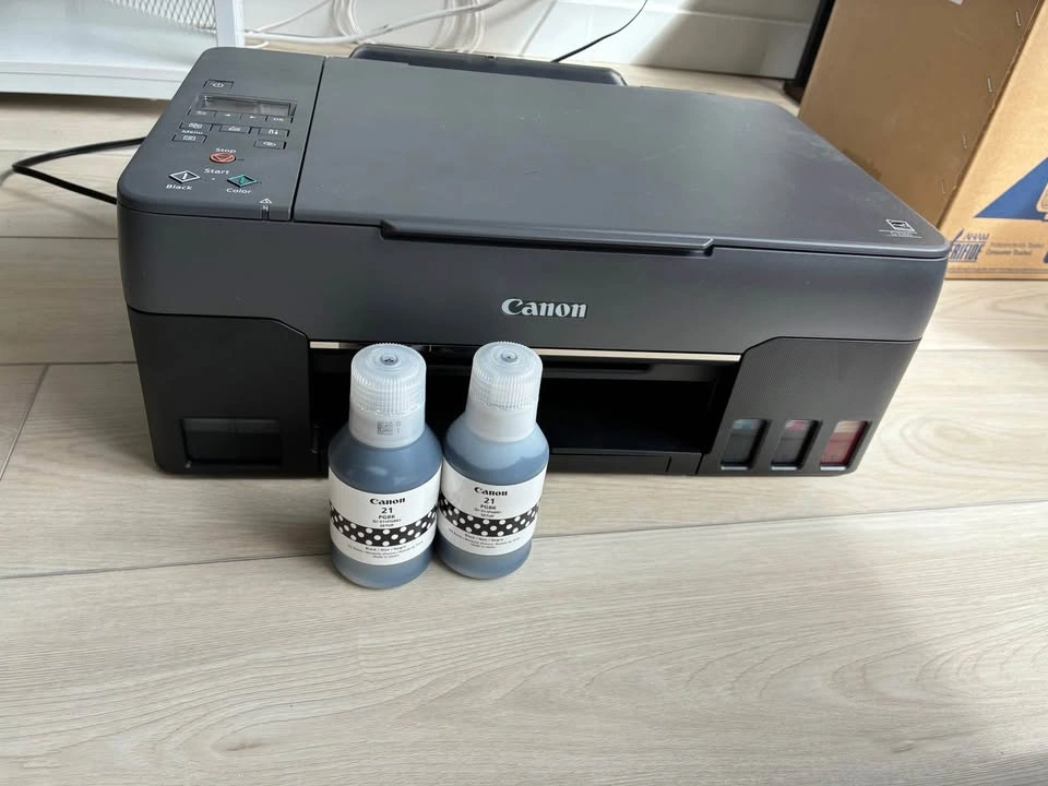 Canon ecotank G3260 with 2 spare bottles of black ink. Fully functional, Ink levels are good. Maintenance cartridge 50% capacity remains.