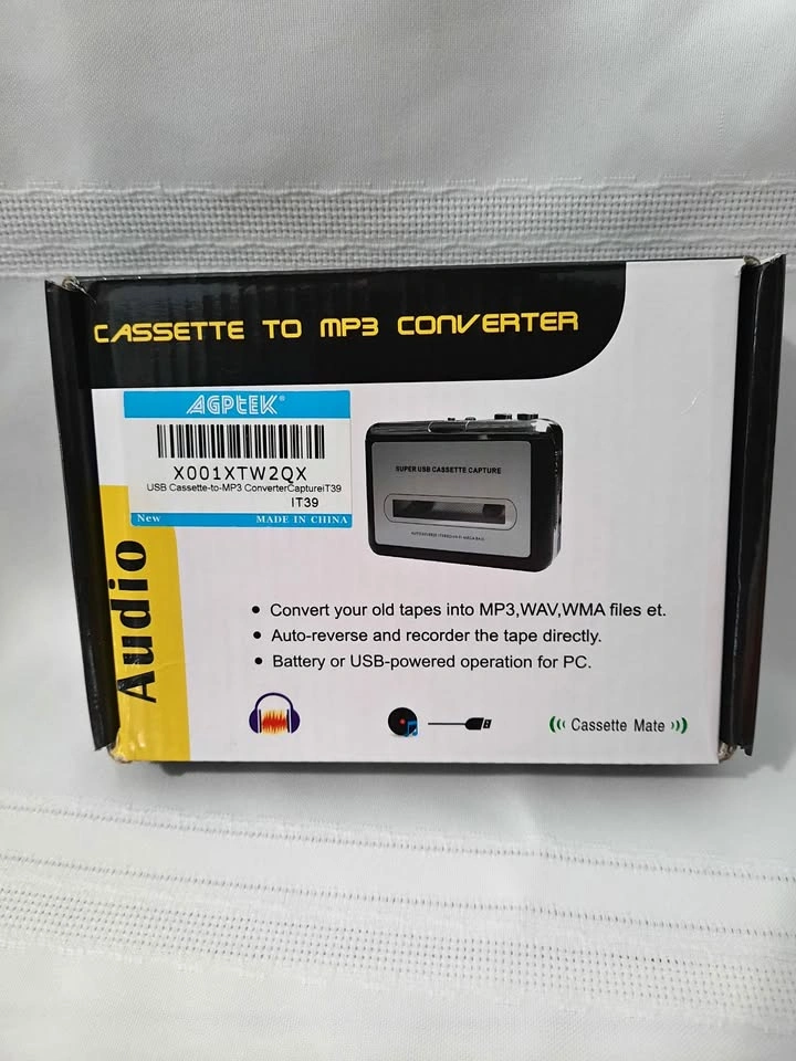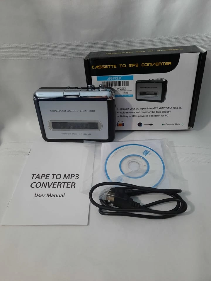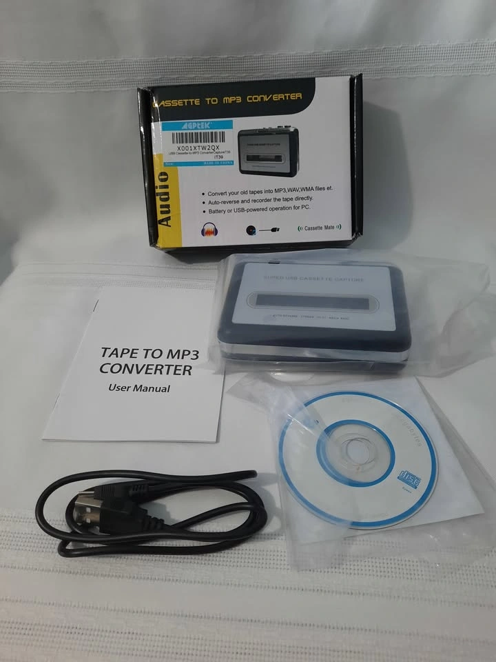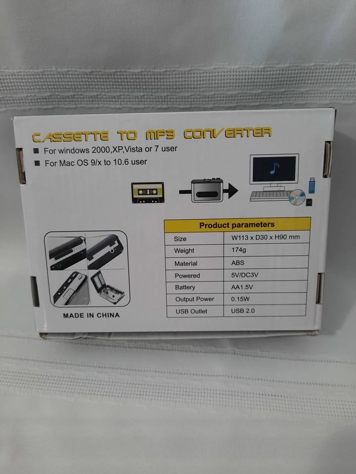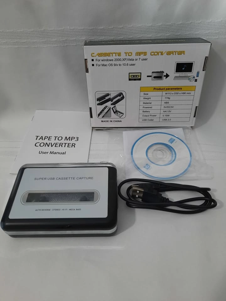 Cassette tape to mp3 converter: Via a USB cable, you can convert old mix tapes and cassette to MP3 to Play on MP3 player or burn to CD. Audacity software: Using software to convert cassette tape to digital MP3. Audio output enables you to listen on your headphones, or other speaker system. Portable design for Cassette Walkman: Compact Size and suitable weight makes you enjoy the music conveniently in any where via 3.5mm jack earphone (included). No installation or drivers required. Package Included: 1 x USB Cassette Capture, 1 x USB Cable, 1 x Software CD, 1 x 3.5mm jack earphone, 1 x User Manual Various compatibilities: Compatible with Windows XP, Vista and Windows 7, mac older than version 10.5. Built-in battery/USB-powered operation.