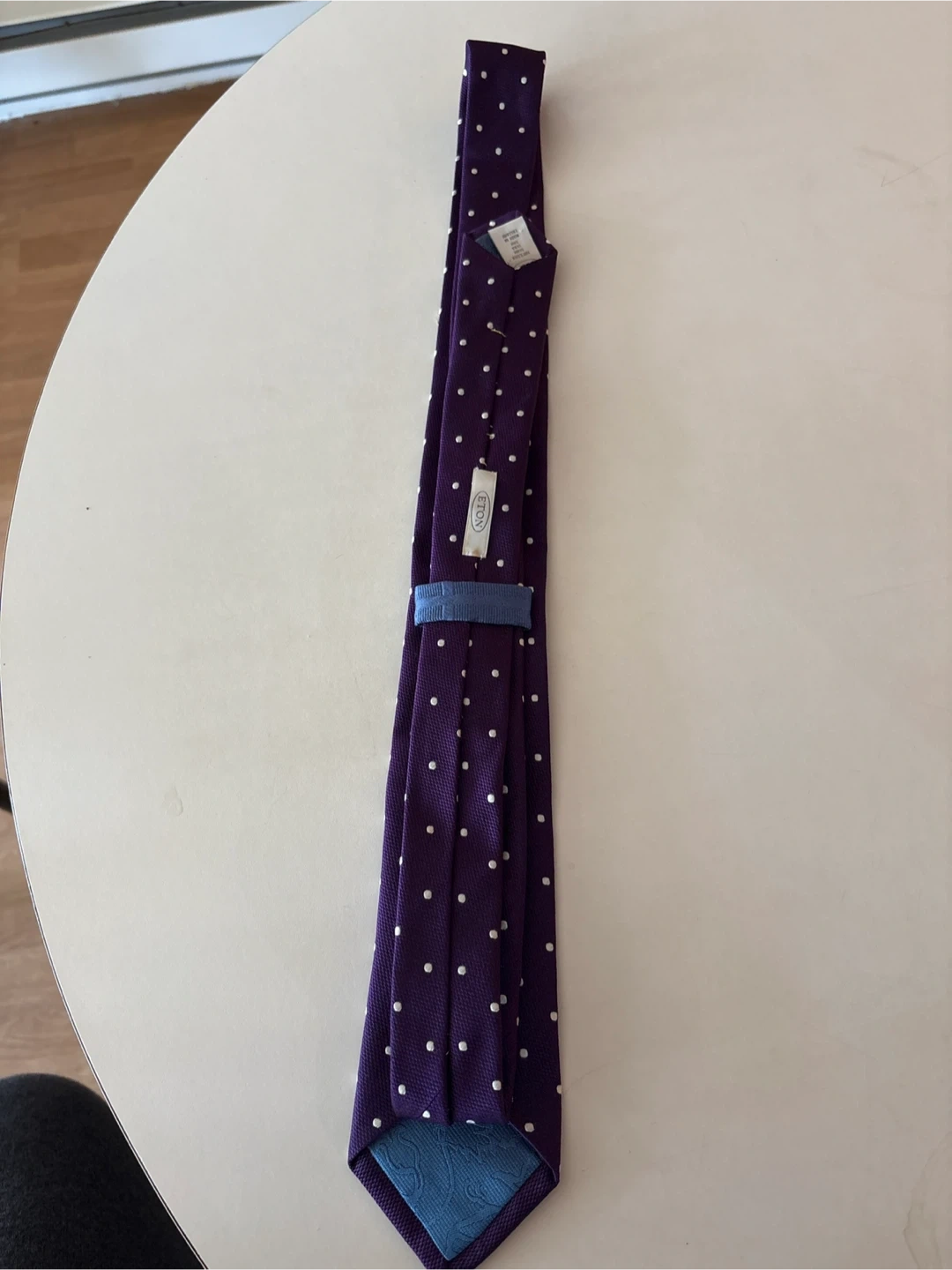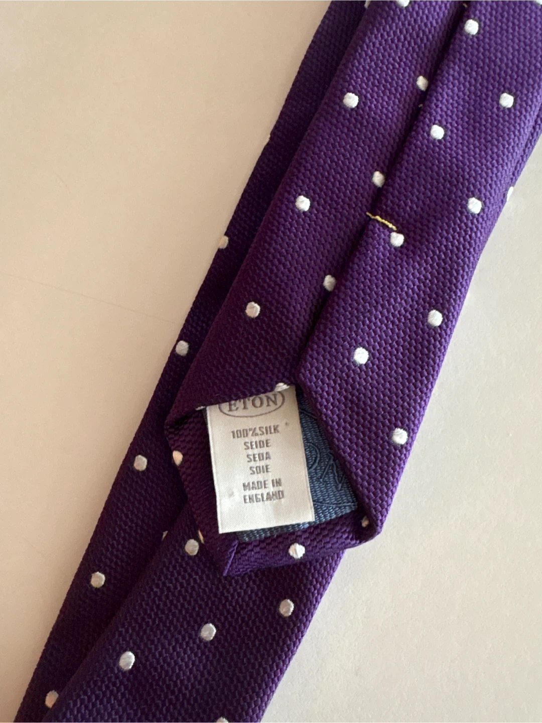Here's a stylish Eton tie made from 100% silk! It features a lovely purple colour with a subtle polka dot pattern. Made in England, this tie is sure to add a touch of sophistication to any outfit