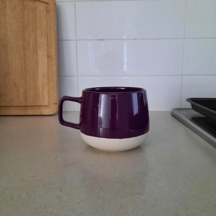 dark purple mug bought from Winners about 3yrs ago no chips or anything dishwasher & microwave safe.