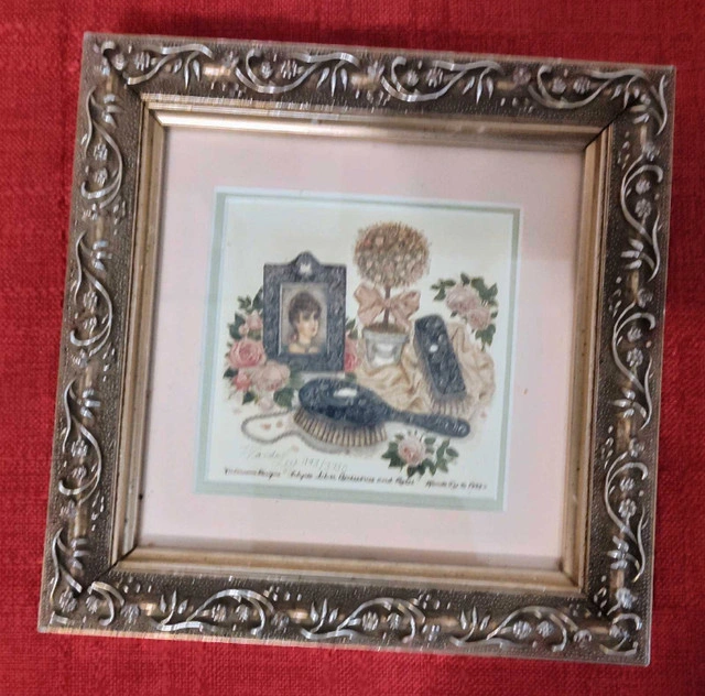 Wanda Lee Victorian Designs 1989 Framed Print Filigree Silver Accessories & Rose 7.5 inches by 7.25 inches. More Info: Vintage, Antiques