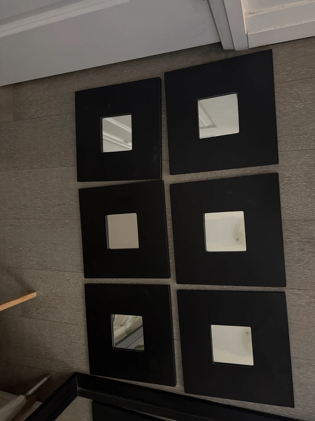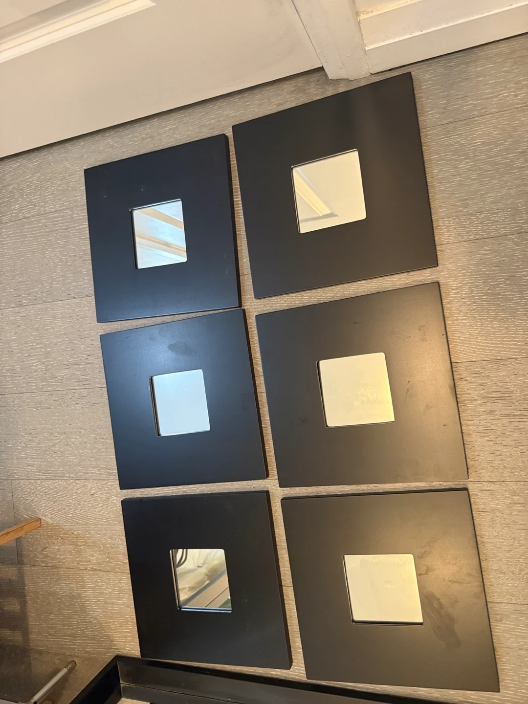 Selling a set of six square mirrors with black frames. They are in great condition and ready to add a modern touch to your space! Perfect for creating a gallery wall or spreading throughout your home