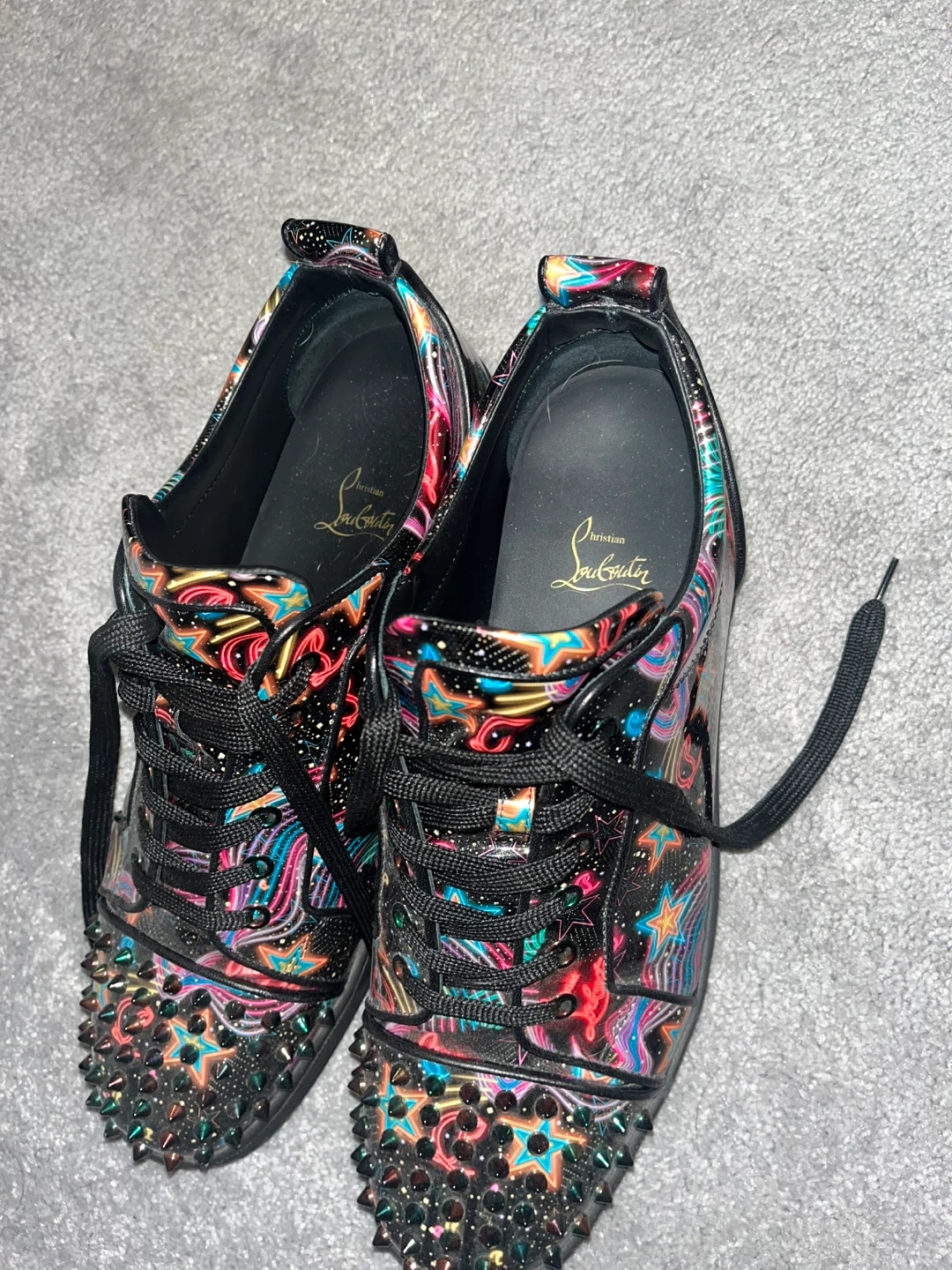 These eye-catching Christian Louboutin sneakers feature a unique, colourful design with star patterns. They have the signature Louboutin spiked detailing on the toe. A stylish statement piece!
