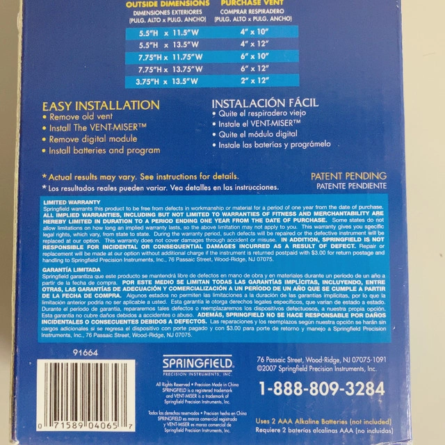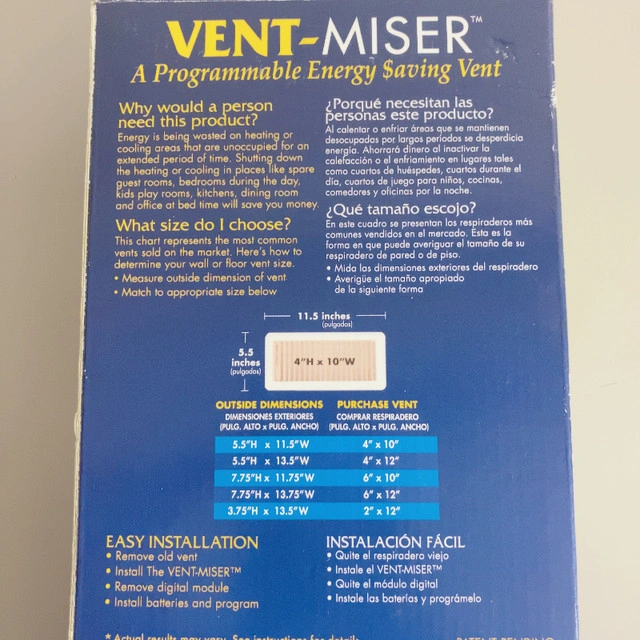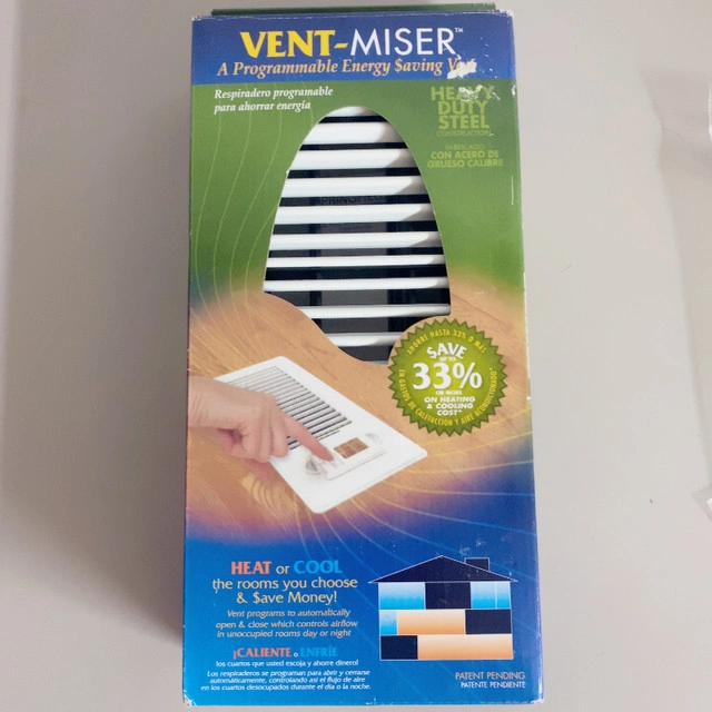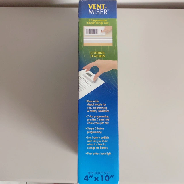 For sale new in Box Programmable Heat Cooling Vent 4" x 10". A programmable energy saving vent. Heavy duty steel construction. Heat or cool the rooms you choose and save money. Vent programs to automatically open and close which controls airflow in unoccupied rooms day or night. Removable digital module for easy programming and battery installation 7 day programming provides 2 open and close cycles per day Simple 3 button programming Low battery audible alert lets you know when it is time to change the battery Push button back light Fit duct size 4" x 10". Thanks for reading.