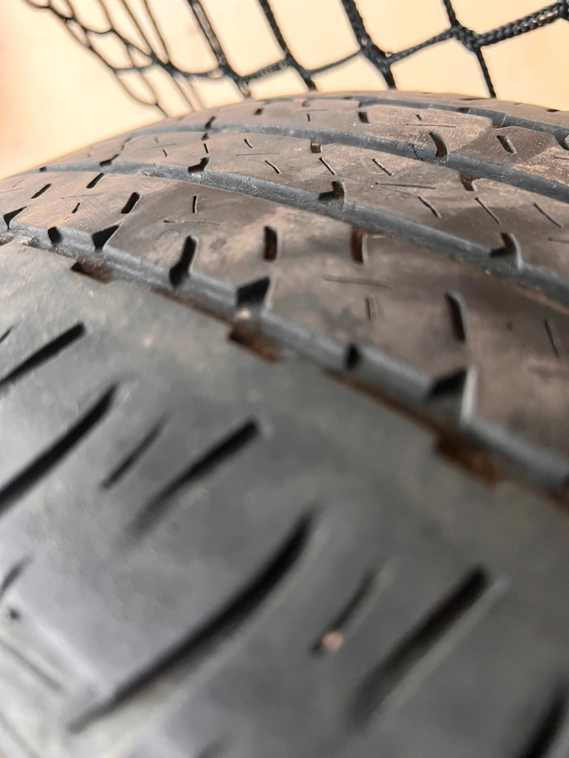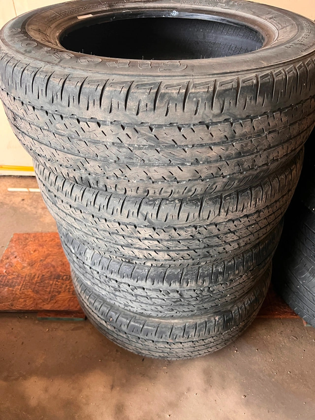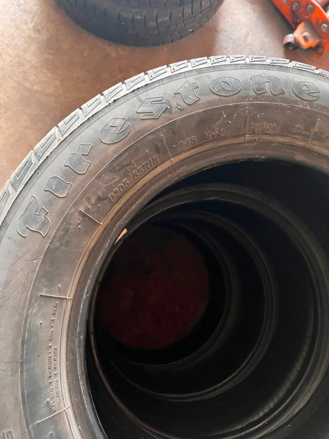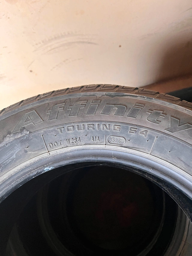 For sale set 4 tires Firestone Affinity Touring- 205/65/16 94S. Came off Toyota Corolla. Tread on front tires 5/32” (46%). Tread on rear tires 4/32” (38%). No crack no leak no damage. 1 tire had parched, no leak.