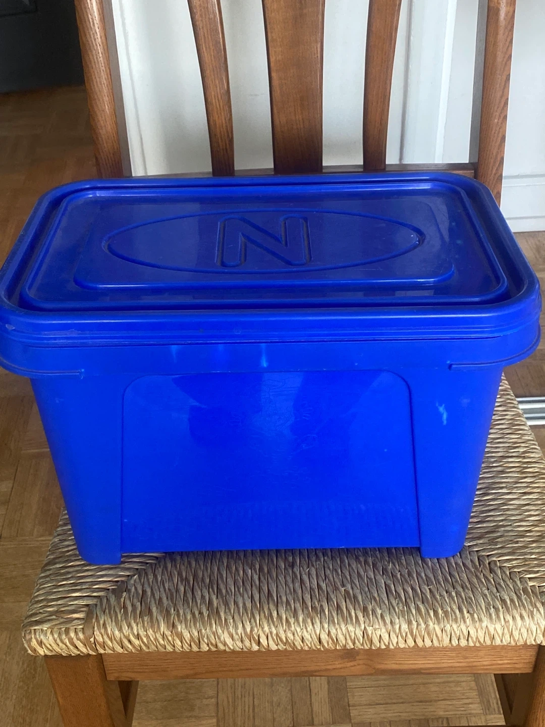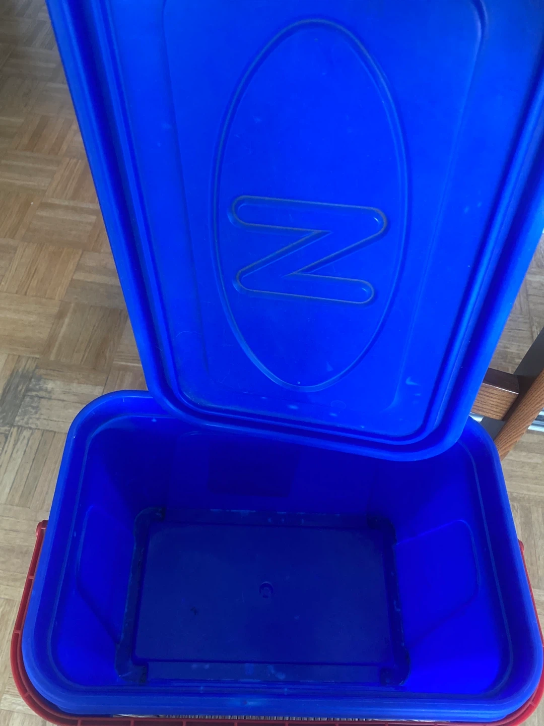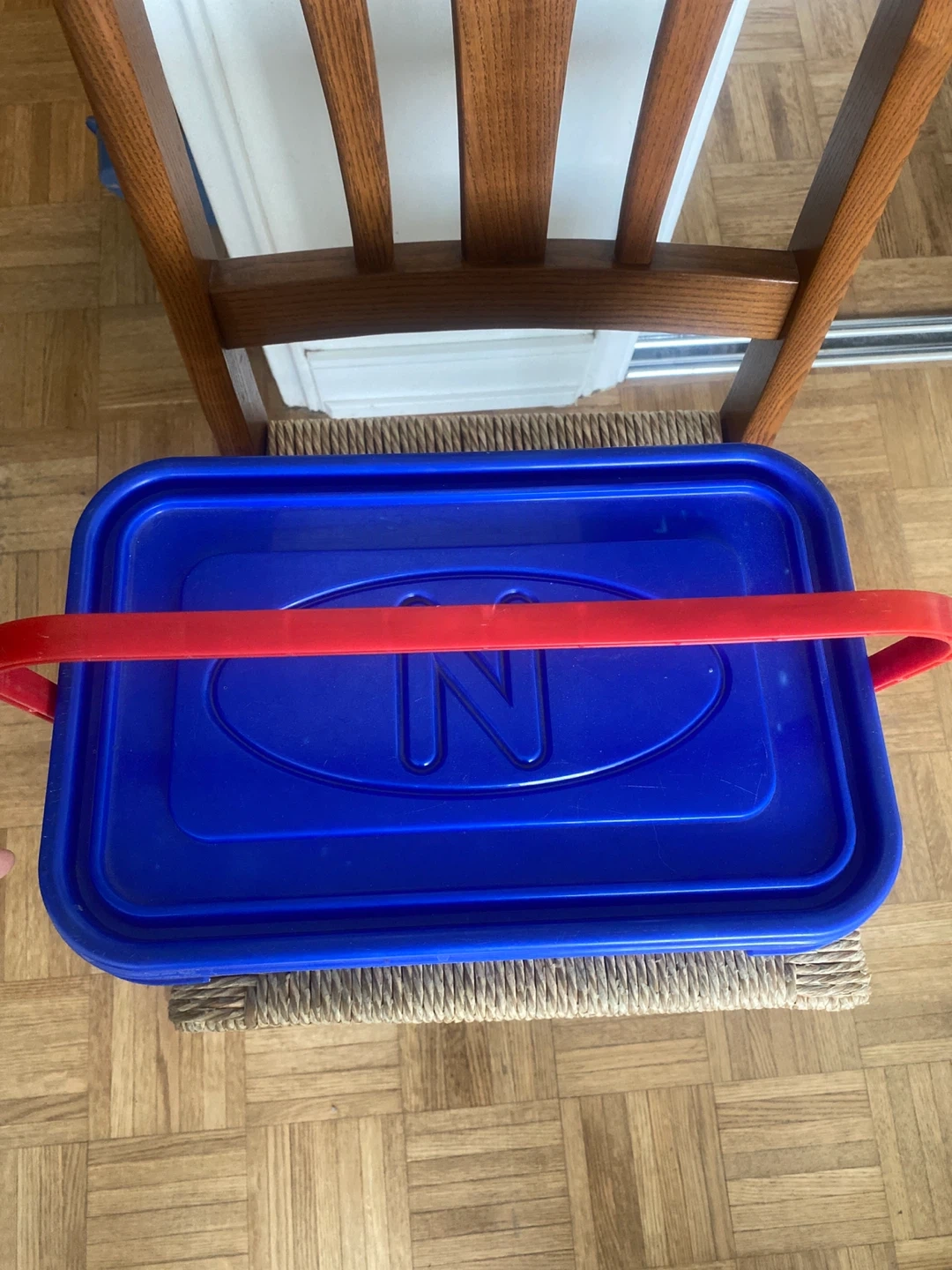 Selling a blue NT storage container. It's in great shape and ready to help you organize your space! The container is a vibrant blue with a red handle, perfect for storing toys, crafts, or household items. It's a practical and durable solution for keeping things tidy