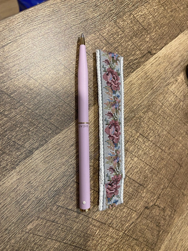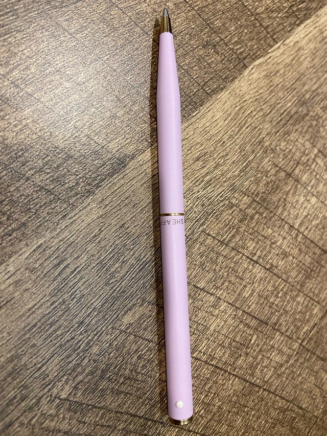 I'm selling a lovely, used Sheaffer pen with a unique lilac colour accompanied by a decorative sleeve. It's in good condition, perfect for adding a touch of elegance to your writing. Here are some details: * Brand: Sheaffer * Colour: Lilac * Condition: Good