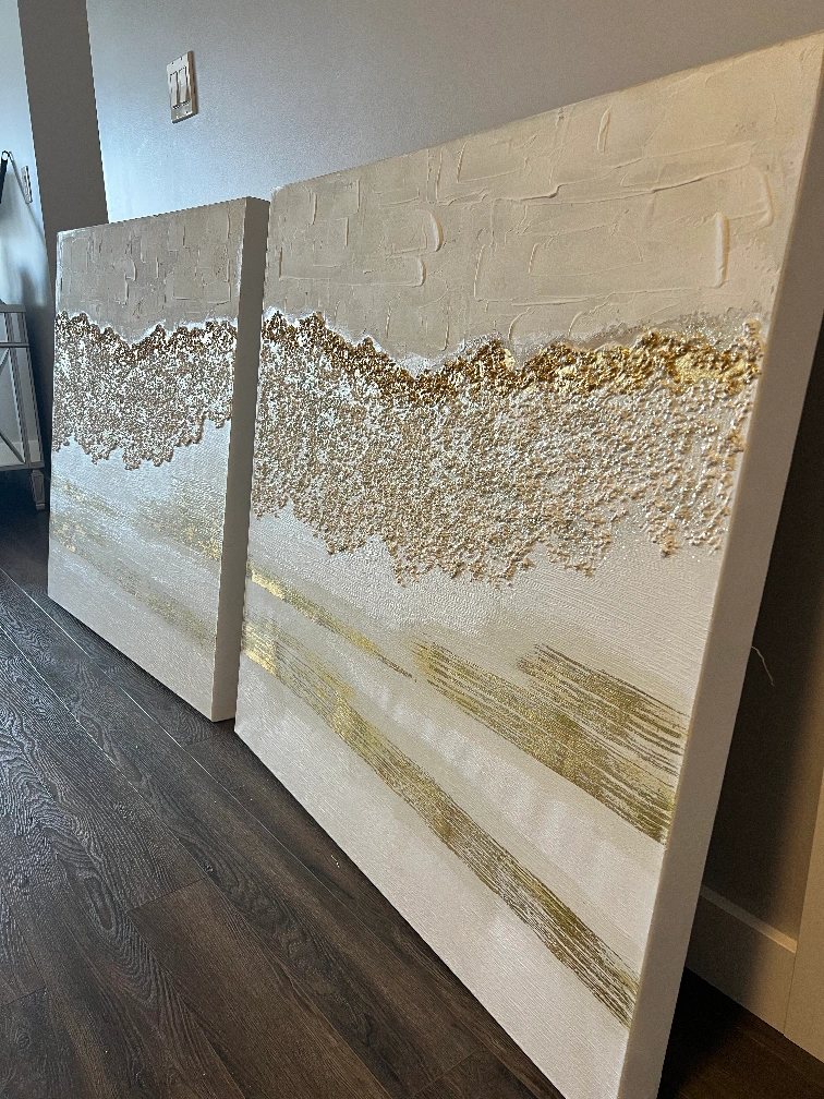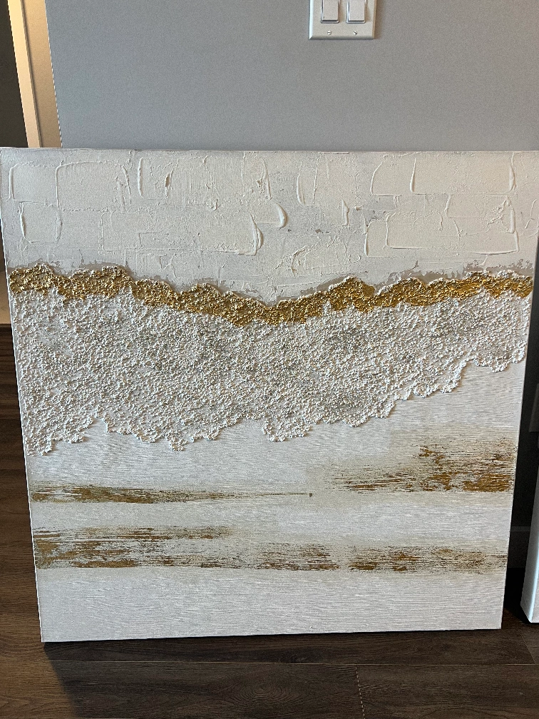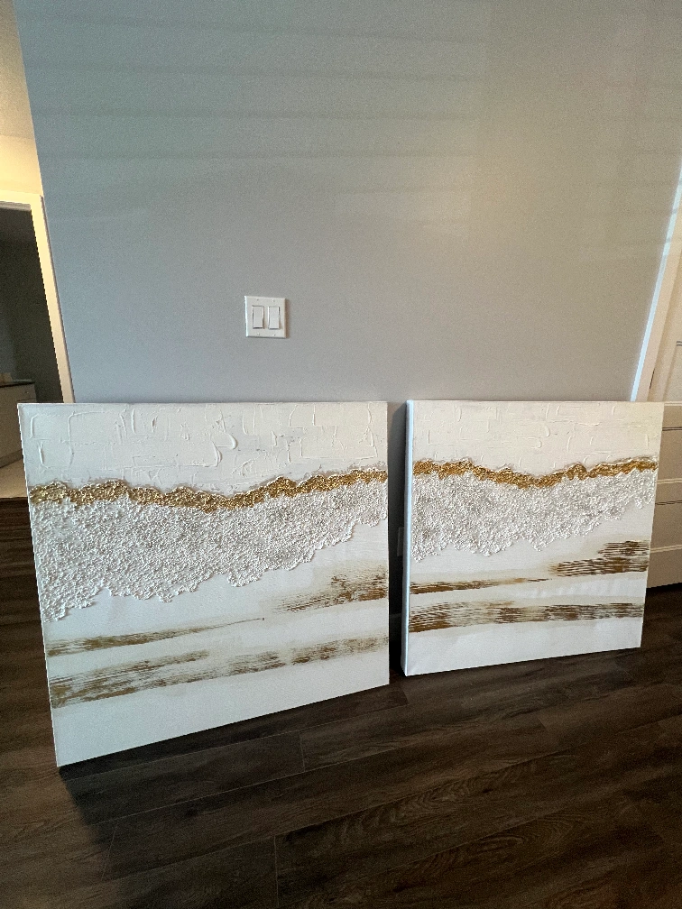 Selling a set of two beautiful textured wall art pieces! They feature a lovely white and gold design that would add a touch of elegance to any room. They are in great condition and ready to find a new home pick up only Cash only see my other posts pick up in Stonycreek $220 for both 39in x 39in